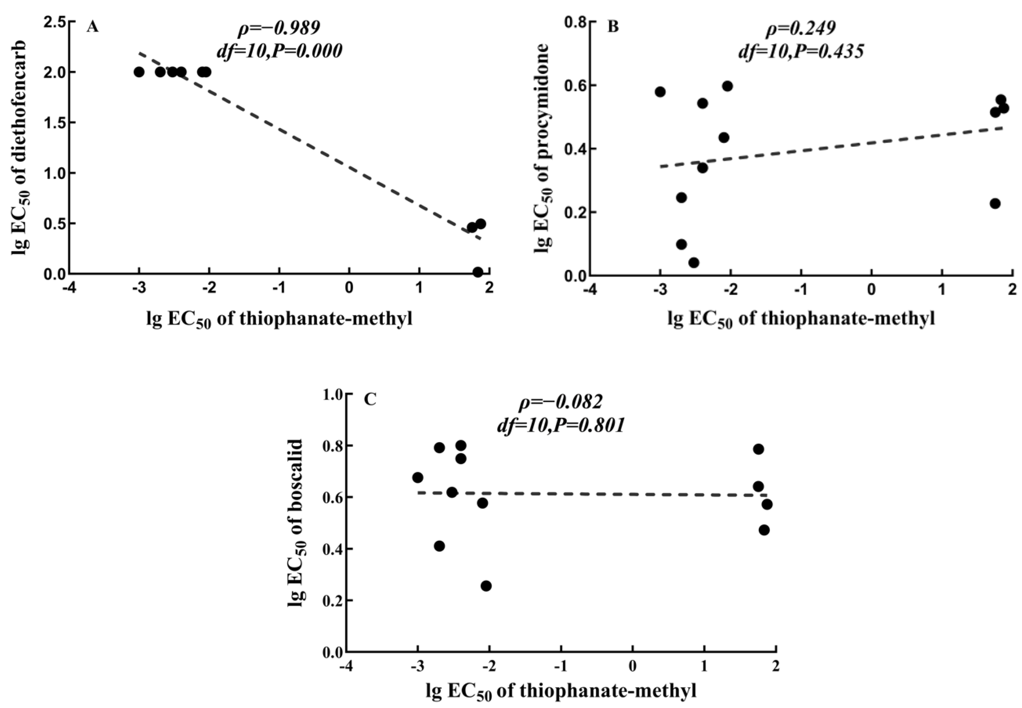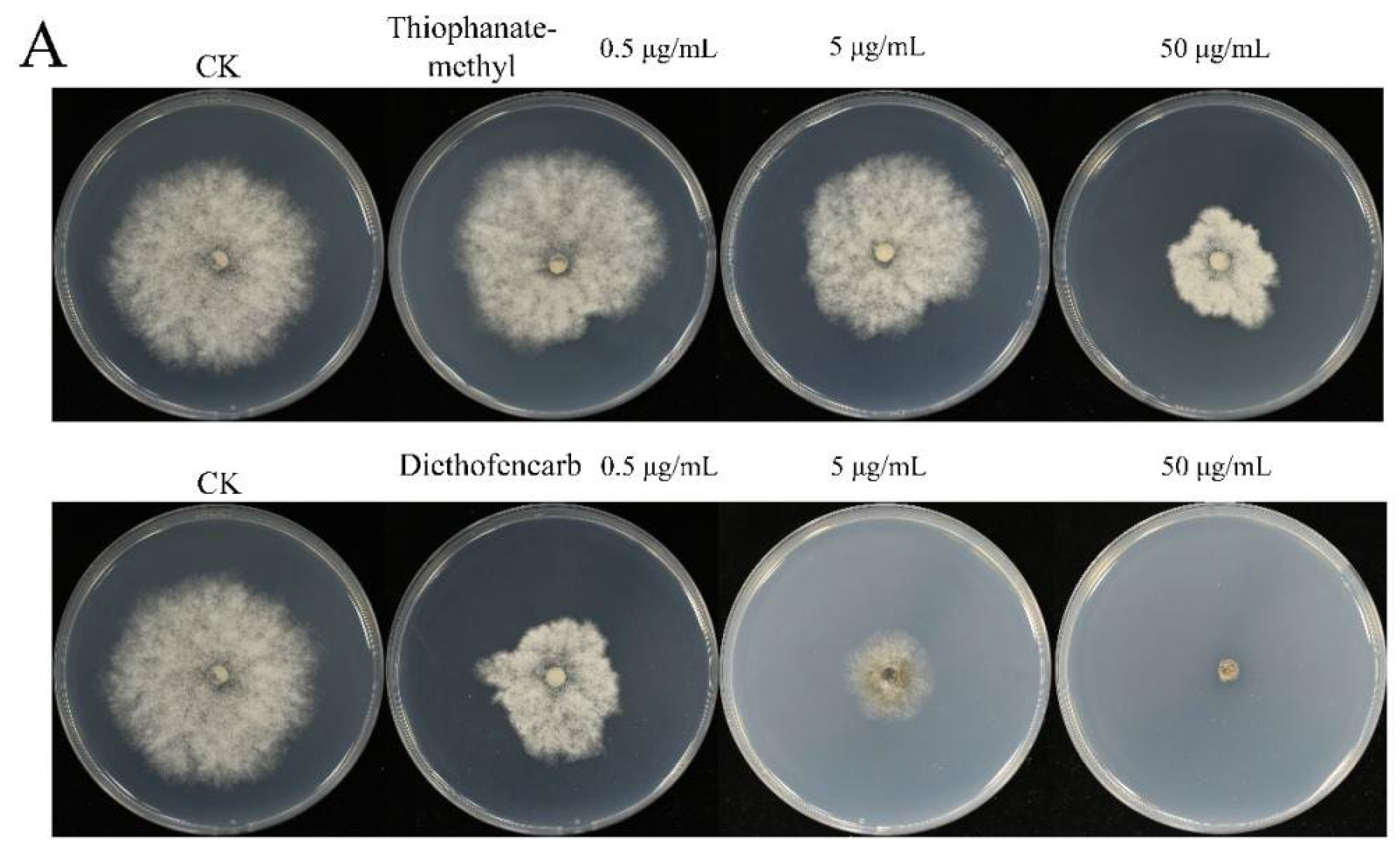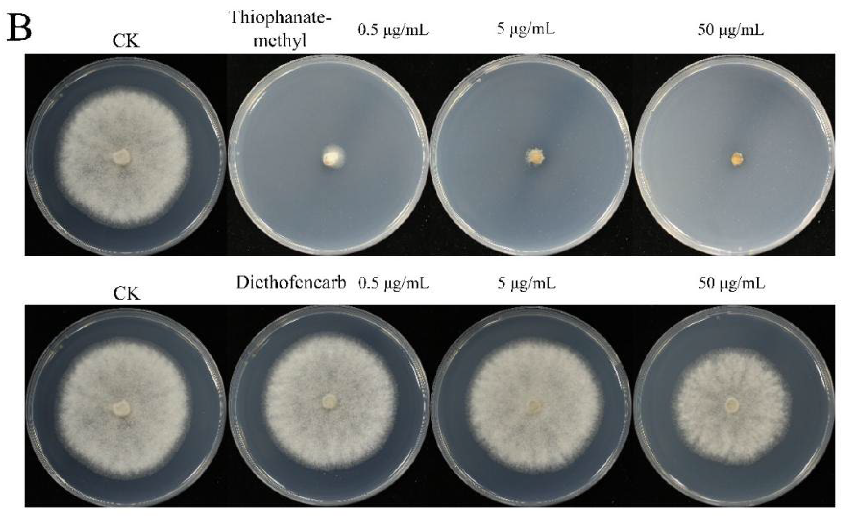 3.5. Cross-Resistance Between Thiophanate-Methyl and Other Fungicides
