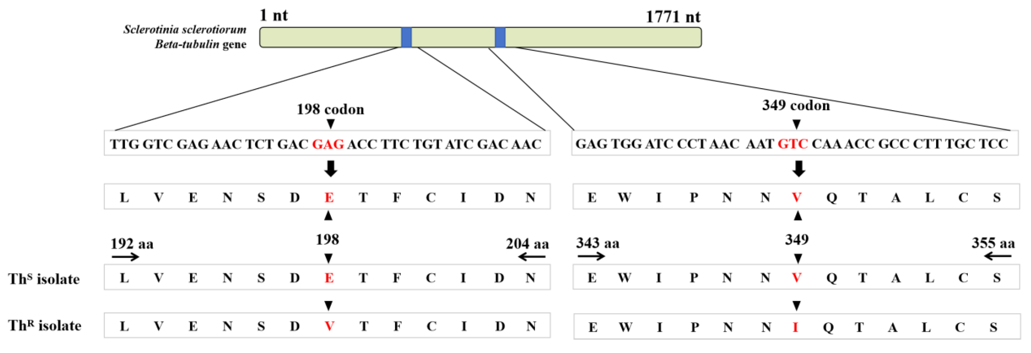 - Ke, D.F.; Meng, H.; Lei, W.T.; Zheng, Y.L.; Li, L.H.; Wang, M.Y.; Zhong, R.; Wang, M.; Chen, F.P. Prevalence of H6Y mutation in β-tubulin causing thiophanate-methyl resistant in Monilinia fructicola from Fujian, China. Pestic. Biochem. Physiol. 2022, 188, 105262. [Google Scholar] [CrossRef] [PubMed]