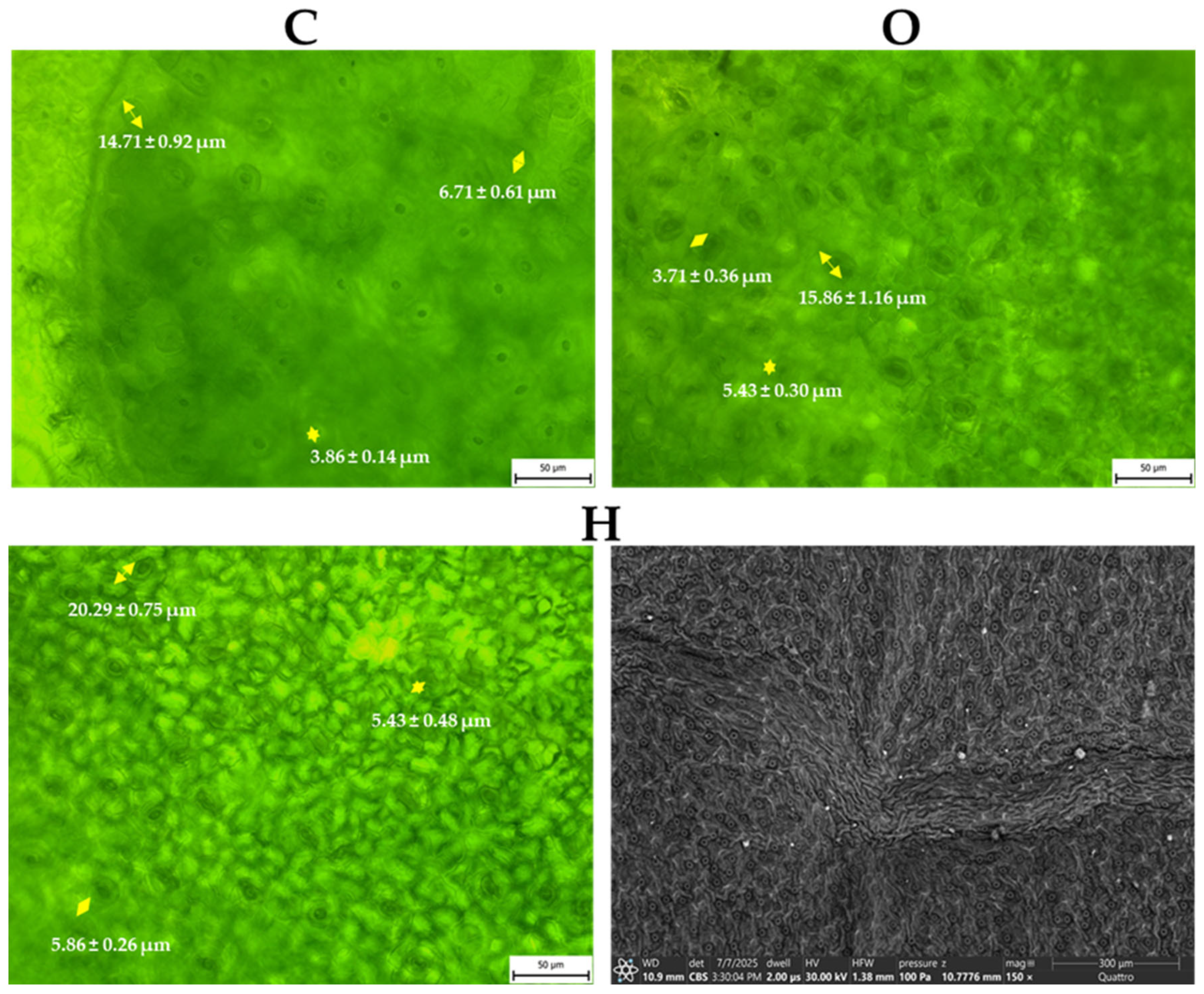 | Stomatal Frequency (mm2) | Osteole Opening (µm) | Guard Cells Length (µm) | Guard Cells Width (µm) | Leaf Area (mm2) | |