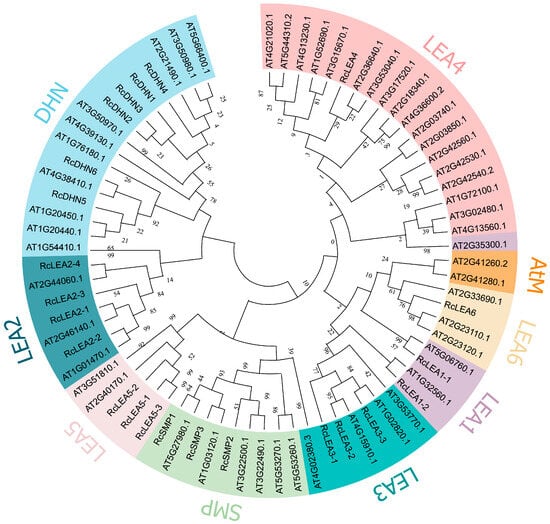 Phylogenetic relationships of LEA proteins of A. thaliana and R. chinensis ‘Old Blush’. Phylogenetic analysis was performed in MEGA 11 employing the neighbor-joining algorithm. The 8 subfamilies are distinguished by different colors.