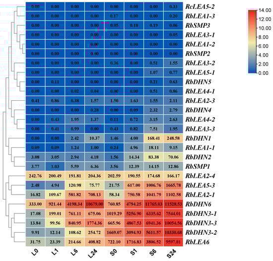 Expression of RbLEA genes under cold stress. Heatmap depicting the expression dynamics of RbLEA genes in leaves (L) and stems (S) of R. beggeriana after chilling treatment at 4 °C for 0, 1, 6, and 24 h. The number in each square (heatmap cell) represents the FPKM. The color gradient from red to blue represents log2-transformed FPKM values, indicating high to low expression levels, respectively.