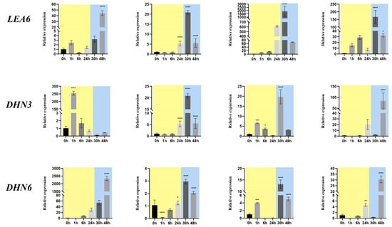 qRT-PCR profiling of LEA genes with elevated expression in Rosa chinensis ‘Old Blush’ and Rosa beggeriana. Standard deviations are shown as error bars, and statistical significance is indicated by asterisks when comparing the untreated control (0 h) with samples exposed to cold at 4 °C for 1, 6, and 24 h or −4 °C for 6 and 24 h (* p < 0.05, ** p < 0.01, *** p < 0.001, **** p < 0.0001). Stages of 4 °C treatment are highlighted with a yellow background, whereas −4 °C treatment stages are marked with a blue background.