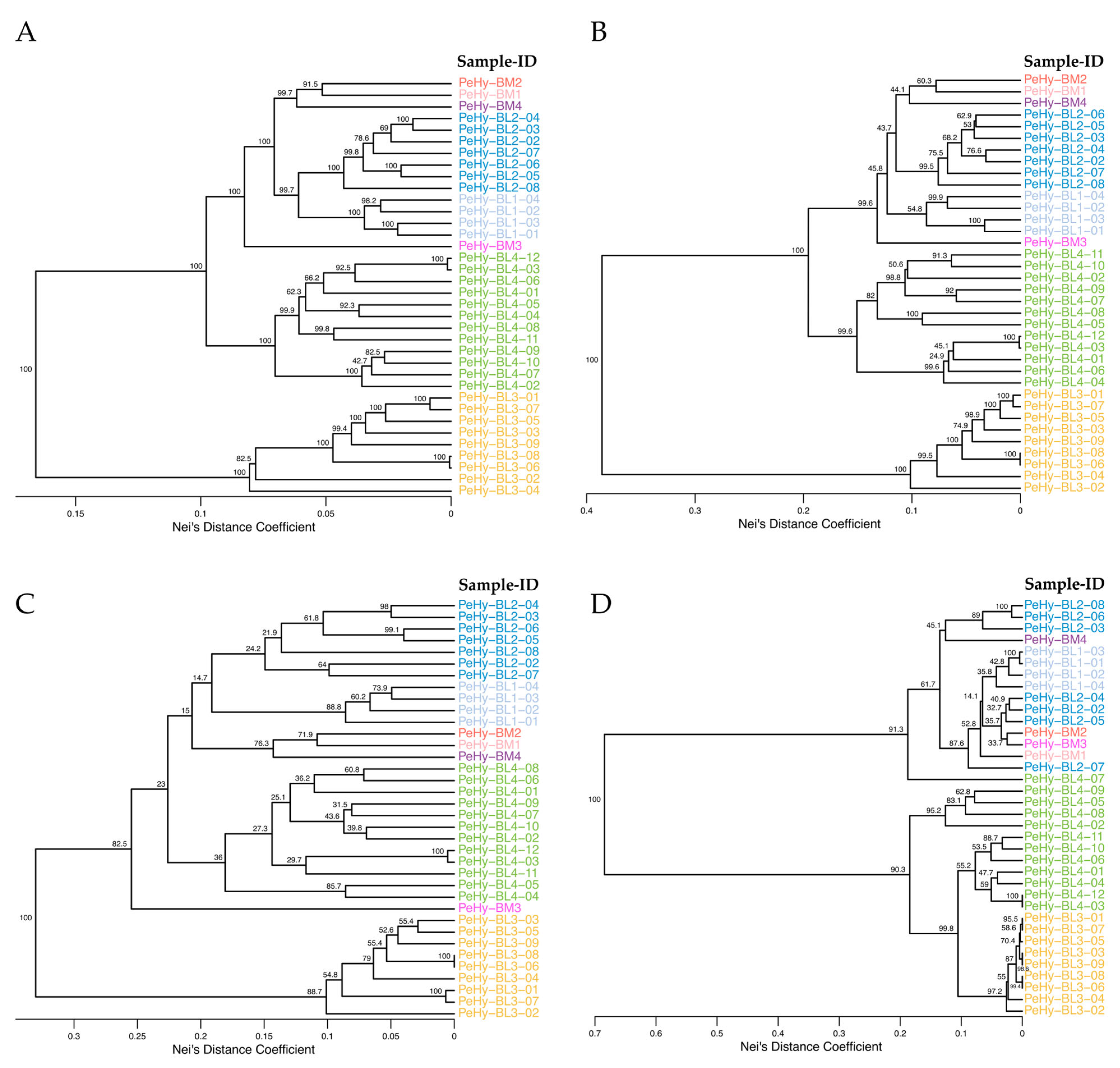- Kamvar, Z.N.; Tabima, J.F.; Grünwald, N.J. Poppr: An R Package for Genetic Analysis of Populations with Clonal, Partially Clonal, and/or Sexual Reproduction. PeerJ 2014, 2014, e281. [Google Scholar] [CrossRef]