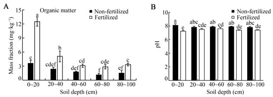 Long-term fertilization significantly altered soil properties, increasing organic matter (SOM) and decreasing pH, with both effects most pronounced in the surface layer (Figure 2). Relative to the unfertilized control, the SOM content was significantly higher in fertilized soil at all sampled depths except 40–60 cm. Notably, in the 0–20 cm layer, the SOM increased by approximately 3.7-fold (Figure 2A). Within the fertilized soil profile, the SOM content in the 0–20 cm layer was also significantly higher than that in the 40–60, 60–80, and 80–100 cm depths. Concurrently, soil pH showed significant acidification. In the 0–20 cm layer, pH decreased by about 0.8 units compared with the control (from ~8.1 to ~7.3), and this significant reduction persisted down to 40–60, 60–80, and 80–100 cm depth (Figure 2B). In contrast, the unfertilized control soil exhibited no significant variation in pH across the 20–40, 40–60, 60–80, and 80–100 cm profiles (Figure 2).