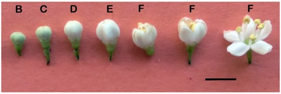 Flower buds of Sambucus australis in different stages of development. Bar = 10 mm. Letters indicate the different phases B–F.