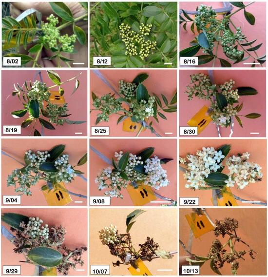 Development of a male inflorescence of Sambucus australis from 2 August to 13 October at the Reserva Ecológica Costanera Sur (Buenos Aires). Bars = 20 mm.