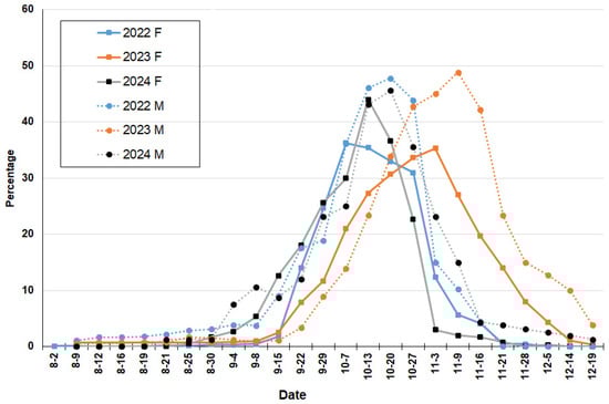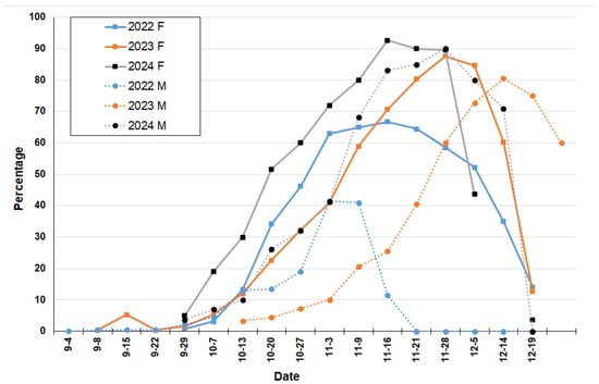 Fruit formation (H phase) and necrotic flowers (G phase) of Sambucus australis registered at Reserva Ecológica Costanera Sur (Buenos Aires) during 2022–2024 years. Full line and letter F for female flowers and dotted line and letter M for male flowers.
