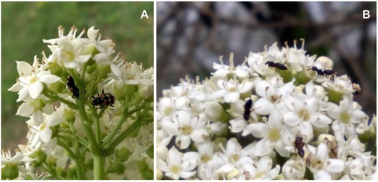 Most of these insects visit the flowers before anthesis, likely attracted by the fragrant scents and pheromones emitted by the elderberry flowers [17,18]. Conversely, this species exhibits allopathic strategies to attract entomophile pollinators [19].