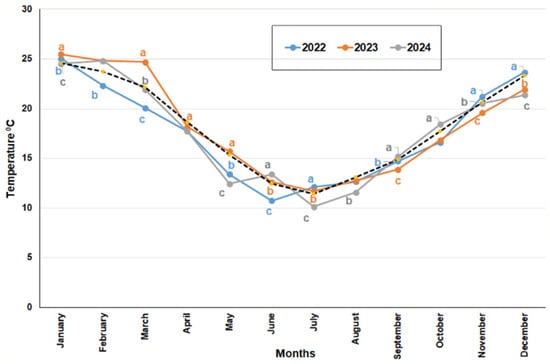 During 2022, rainfall was significantly lower (489 mm) compared to the years 2023 and 2024, which recorded 655 mm and 778 mm, respectively. Significant differences in precipitation were observed among the three years in most months except for June, July, and September (Figure 12). Comparison of the records of the three years with respect to historical values shows significant differences in all months (Figure 12).