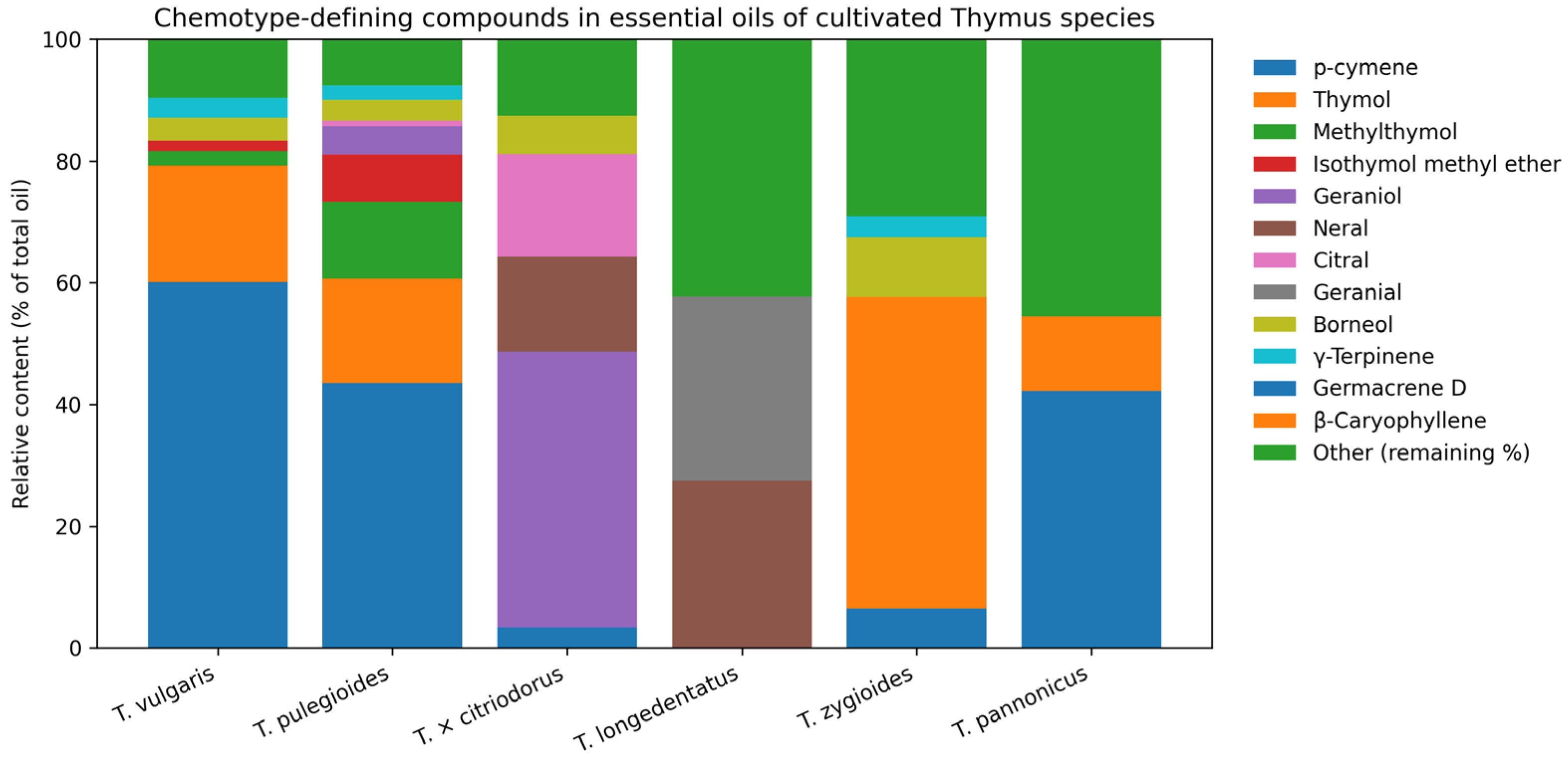 Thymus are well recognized for their therapeutic potential, which is largely determined by the qualitative and quantitative composition of their essential oils. Monoterpenoid phenols such as thymol, oxygenated monoterpenes including citral (neral and geranial), and selected sesquiterpenes have been associated with antimicrobial, anti-inflammatory, antioxidant, and analgesic activities, making chemically well-defined plant material particularly valuable for medicinal and functional applications. Recent pharmacological research increasingly emphasizes effect-directed and bioactivity-guided approaches for the identification of active plant constituents, highlighting the importance of precise phytochemical characterization [
