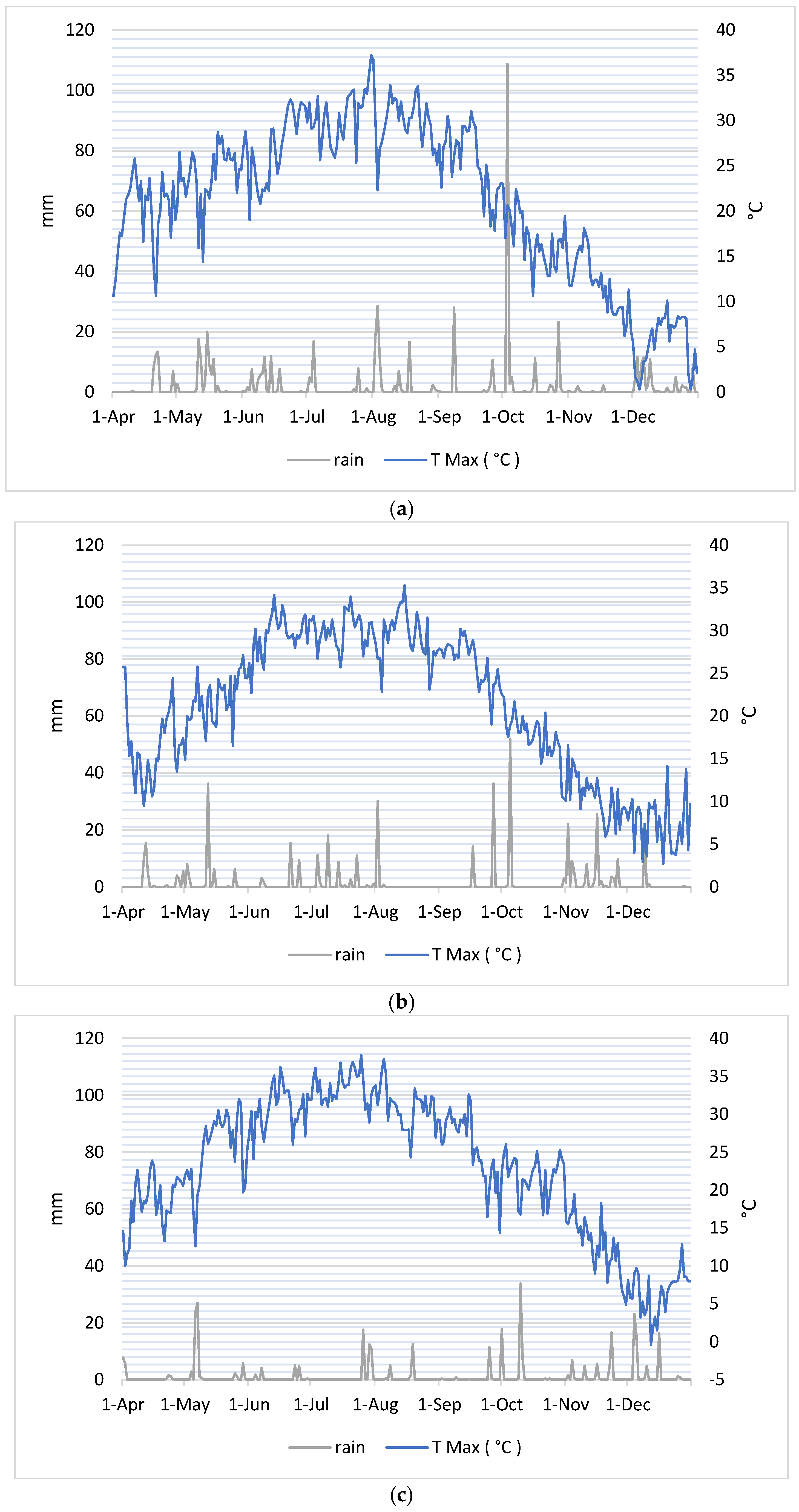 | Tmax (°C) | Tmin (°C) | Tmax-M (°C) | Total Rainfall (mm) | GDD 10° (°C) | Days T > 30 °C (n.) | Rainy Days (n.) | ||||||||