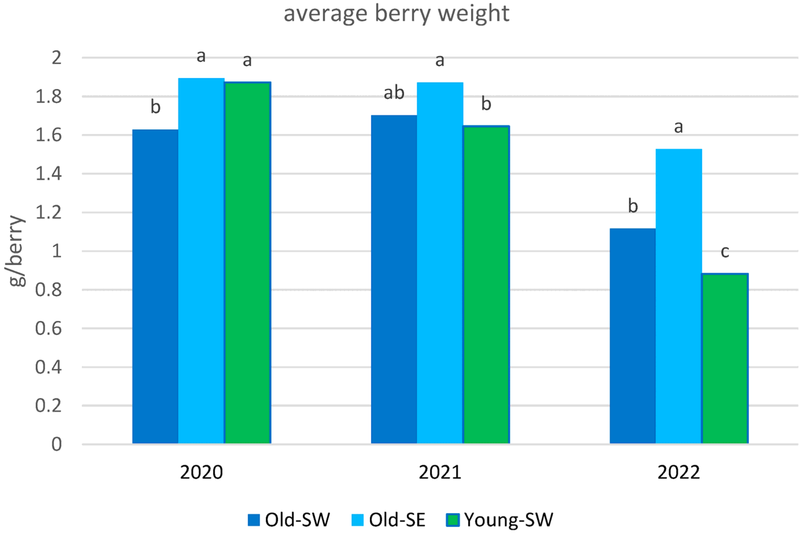| Berry weight (g) | 1.80 a | 1.74 a | 1.18 c | 1.70 a | 1.43 b | 1.41 b | *** | *** | ** |