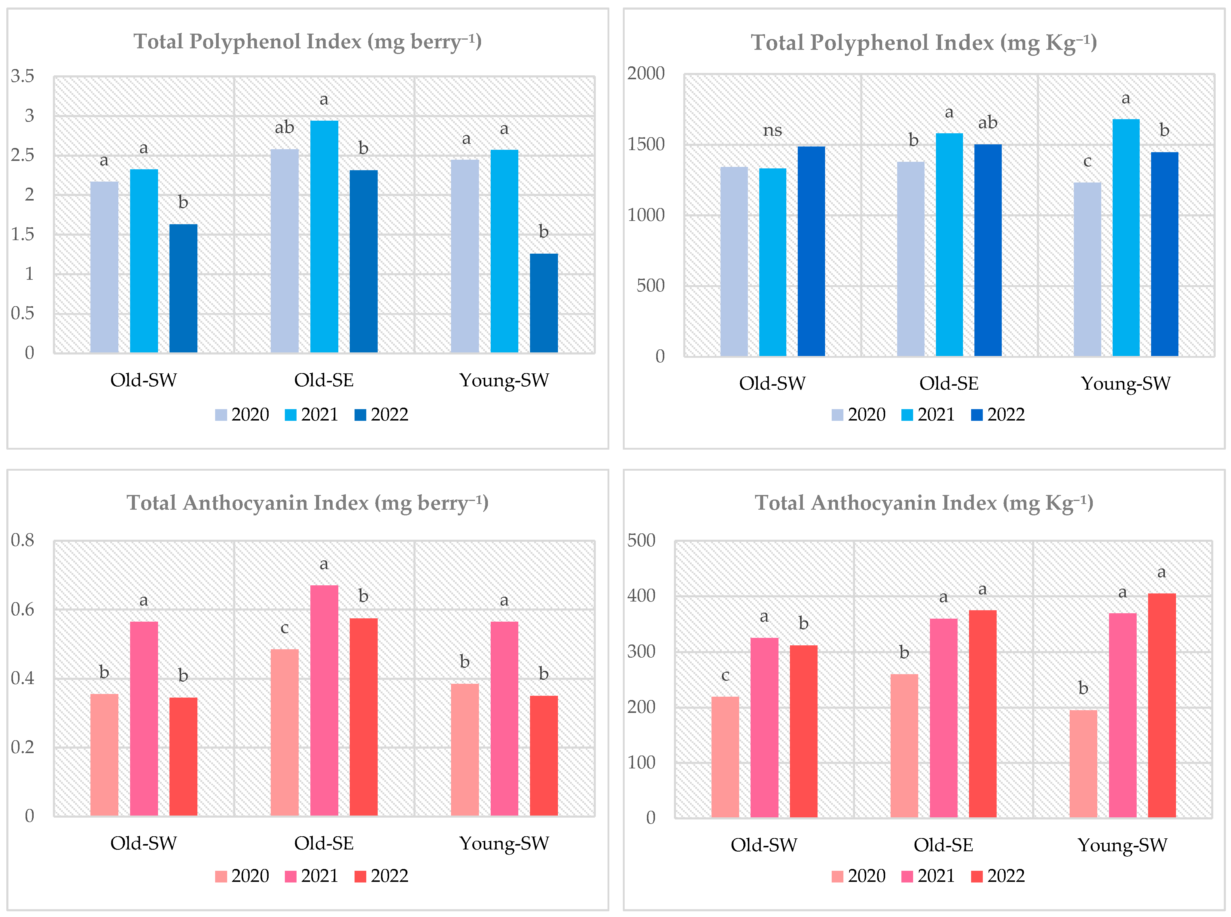 | Year (Y) | Vineyards (V) | ANOVA Results | |||||||