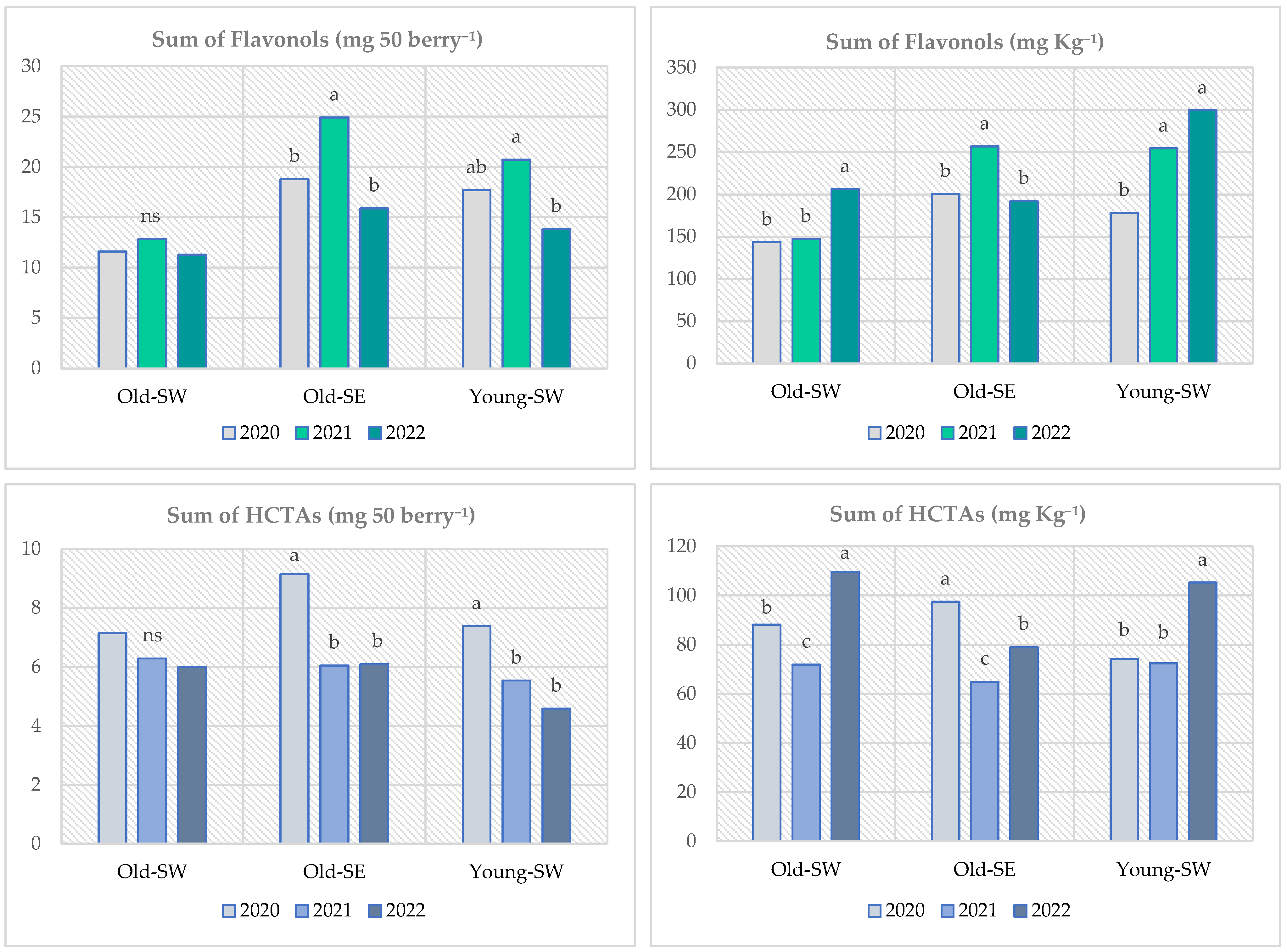 | Year | Vineyard | Miricetin Glucoside | Quercetin Glucuronide | Quercetin Glucoside | Kaempferol Glucuronide | Kaempferol Glucoside | Total Flavonols | |