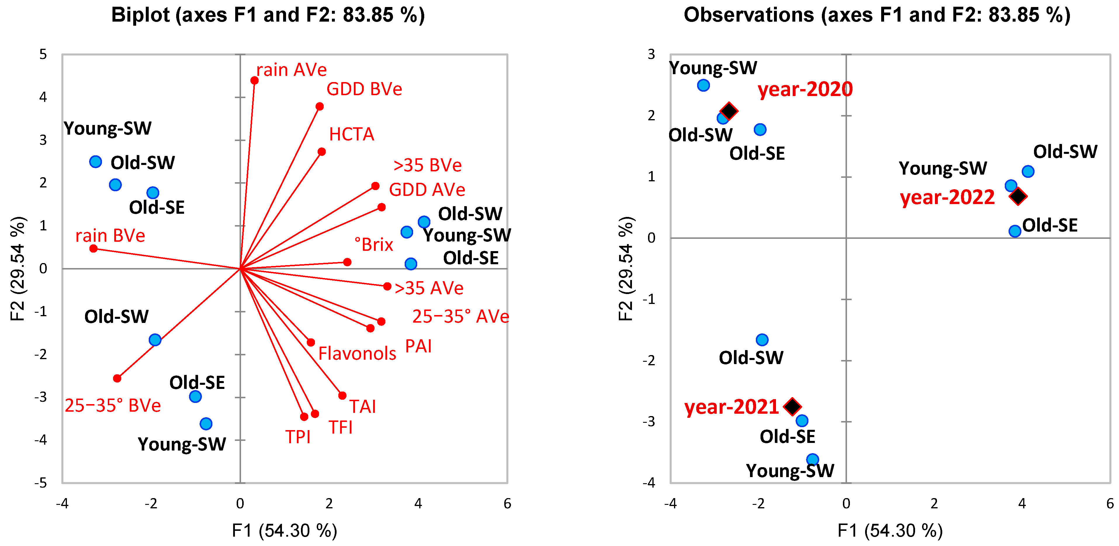 - Asproudi, A.; Bonello, F.; Ragkousi, V.; Gianotti, S.; Petrozziello, M. Aroma Precursors of Grignolino Grapes (Vitis vinifera L.) and Their Modulation by Vintage in a Climate Change Scenario. Front. Plant Sci. 2023, 14, 1179111. [Google Scholar] [CrossRef]