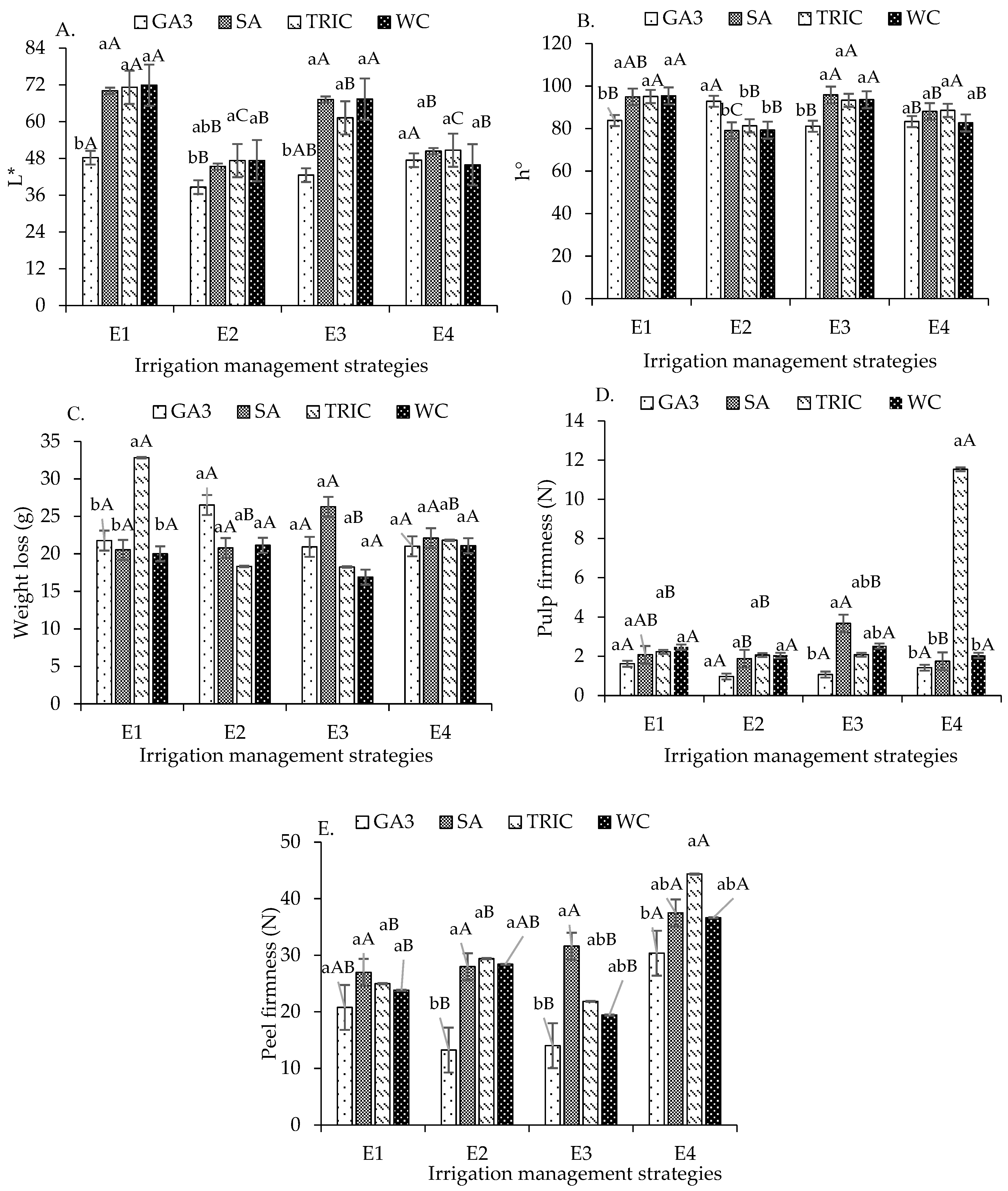 - Acevedo, A.F.G.; Lacerda, V.R.; Avilez, A.M.A.; Silva, J.C.A.; Vieites, R.L. Effects of water deficit stress and salicylic acid preharvest treatments on postharvest biochemical parameters of potato. Food Humanit. 2025, 4, 100463. [Google Scholar] [CrossRef]