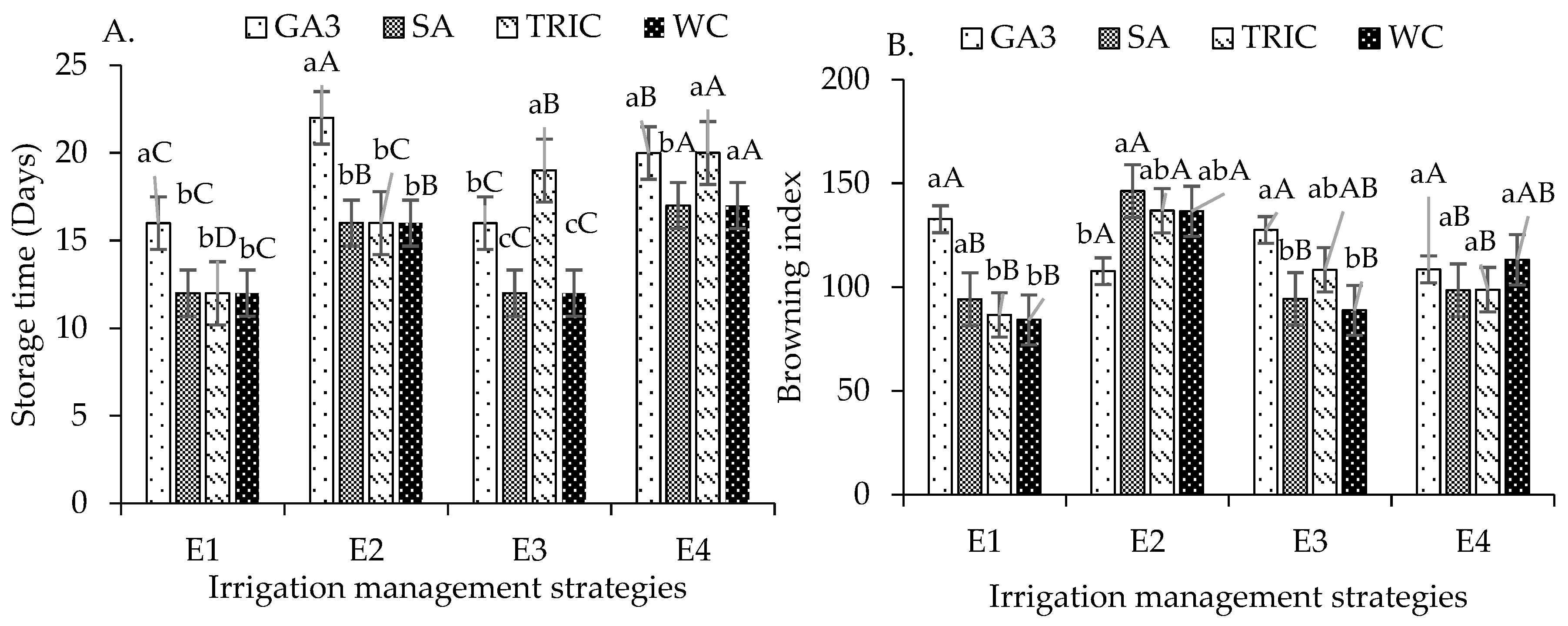 Lima, B.d.M.; Sousa, V.F.d.O.; Soares, L.A.d.A.; Fernandes, P.D.; Lima, G.S.d.; Nascimento, P.L.d.; Paiva, F.J.d.S.; Torres, R.A.F.; Oliveira, V.K.N.; Fátima, R.T.d.; et al. Phenolic Compounds, Phytohormones, and Biological Agents in the Post-Harvest Conservation of ‘Nanicão’ Banana Produced Under Deficit Irrigation. Horticulturae 2026, 12, 264. https://doi.org/10.3390/horticulturae12030264