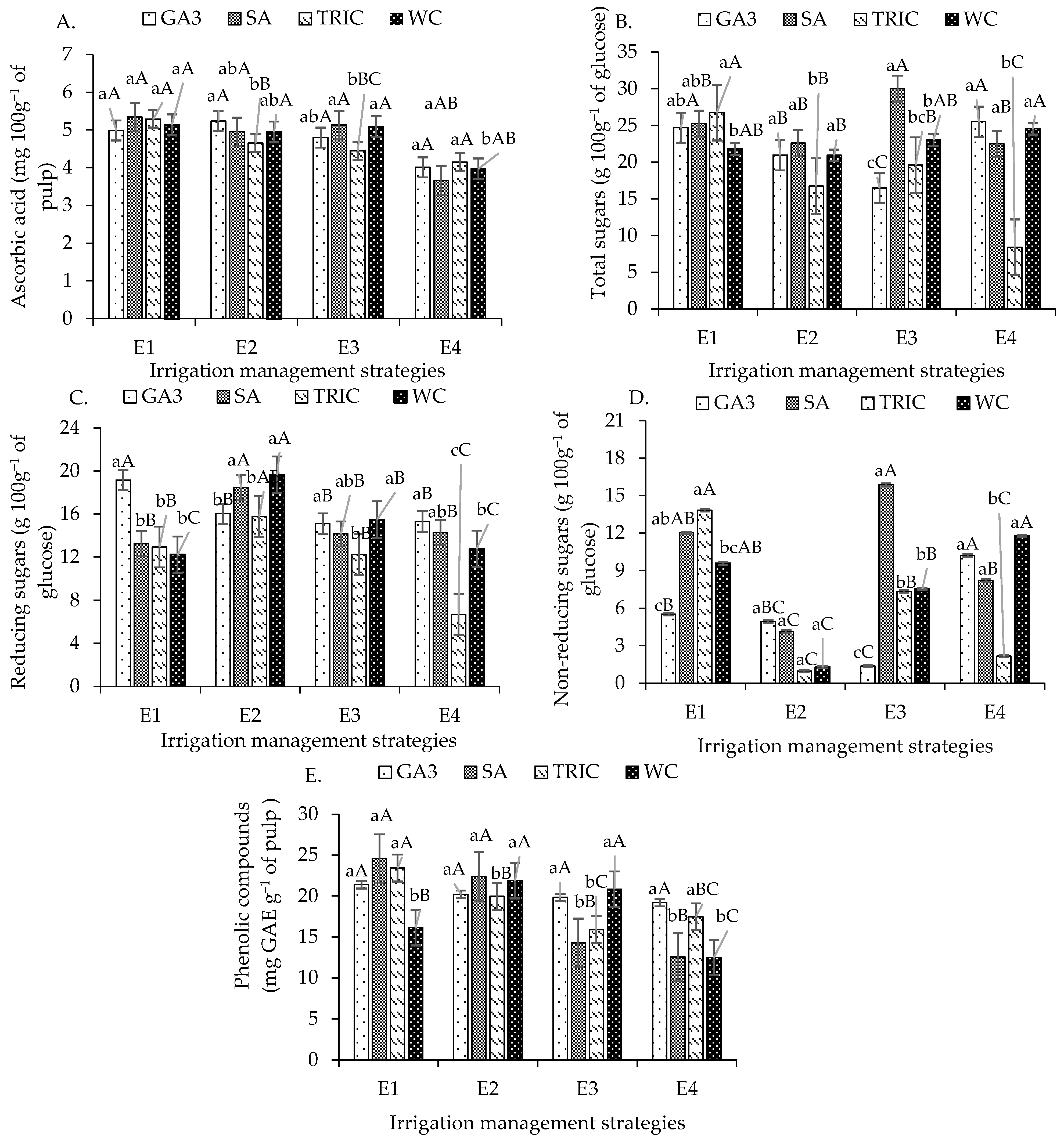 - Fatima, R.T.; Lima, G.S.; Soares, L.A.A.; Lima, B.M.; Pereira, M.B.; Silva, A.A.R.; Nóbrega, J.S.; Paiva, F.J.S.; Gheyi, H.R.; Souto, A.G.L.; et al. Production and postharvest quality of sour passion fruit under deficit irrigation strategies and foliar application of ascorbic acid. N. Z. J. Crop Hortic. Sci. 2024, 53, 1809–1833. [Google Scholar] [CrossRef]