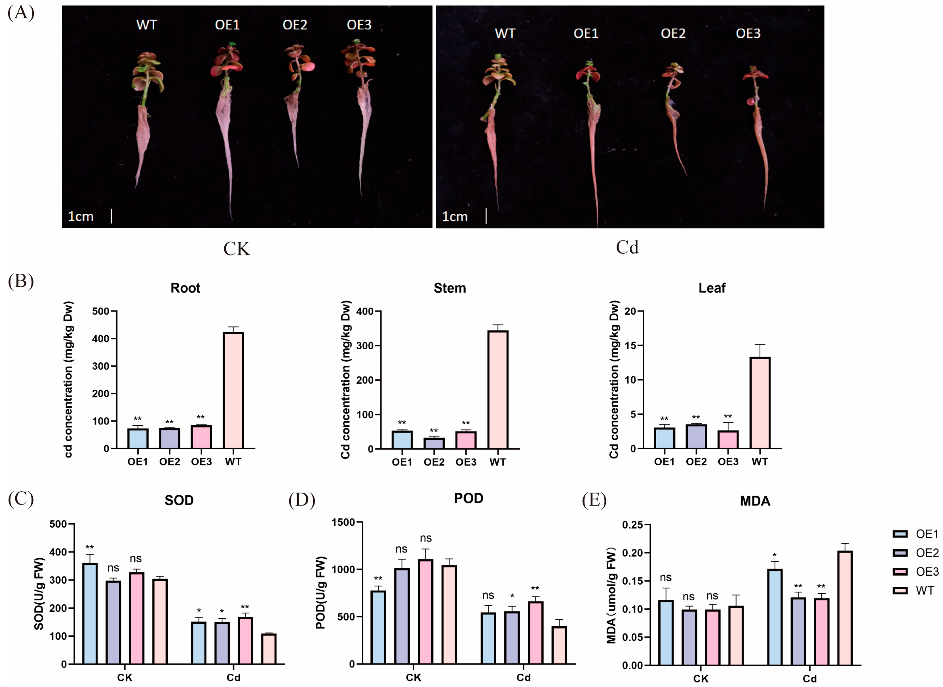 3.4. Overexpressing of SpNAC089 Enhances Cd Tolerance and Reduces Cd Accumulation