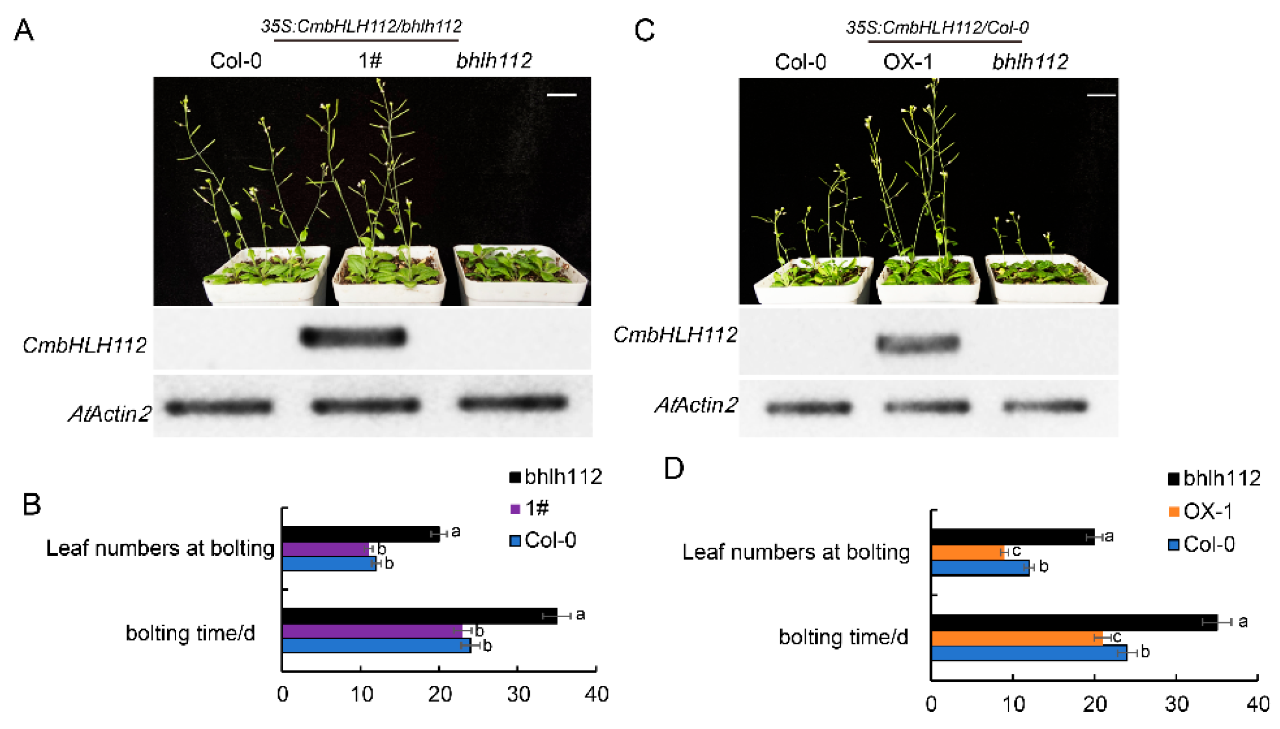 3.4. Overexpression of CmbHLH112 Promoted Flowering in Arabidopsis