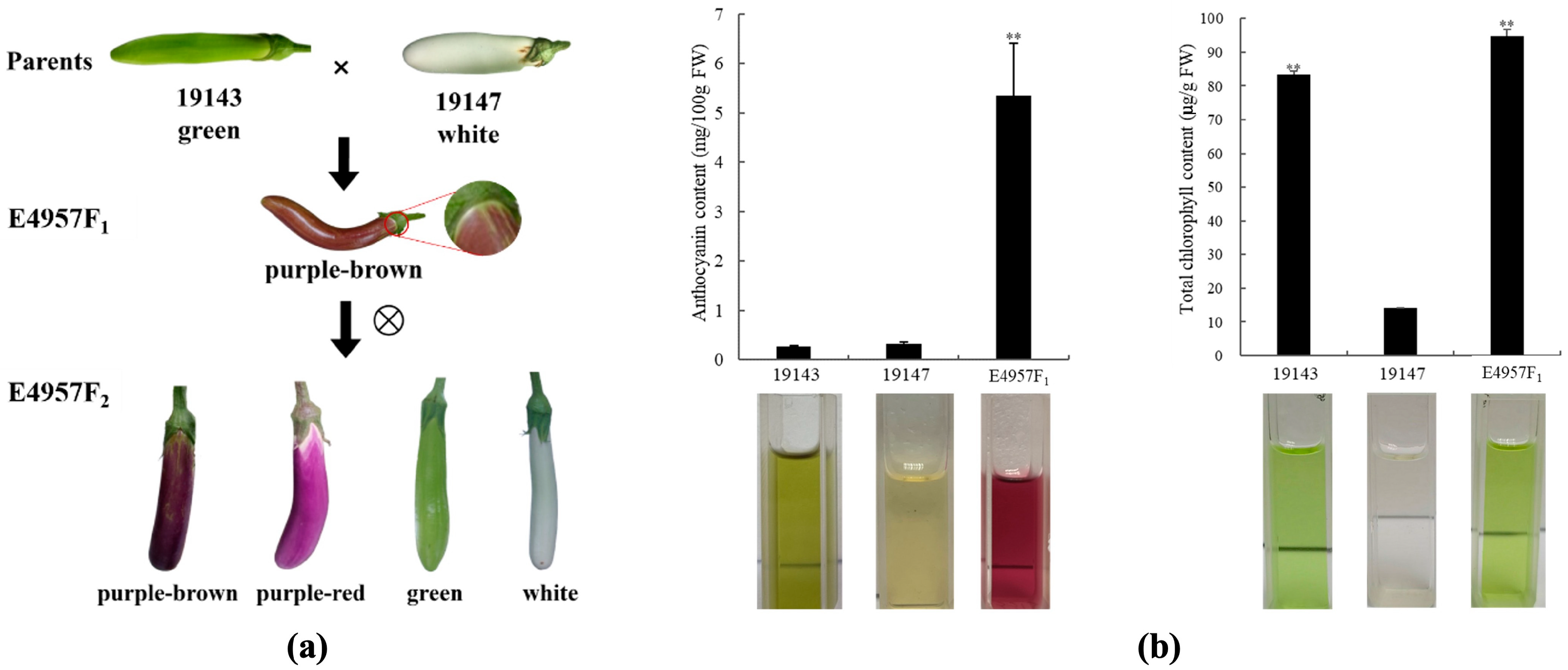 - Chen, J.R.; Lü, Z.J.; Fan, L.S.; You, Q.; Li, T.; Gong, C.; Sun, G.W.; Li, Z.L.; Sun, B.J. Analysis of genetic effect of fruit color controlled by epistatic genes in eggplant. Agric. Sci. China 2023, 56, 4729–4741. [Google Scholar] [CrossRef]