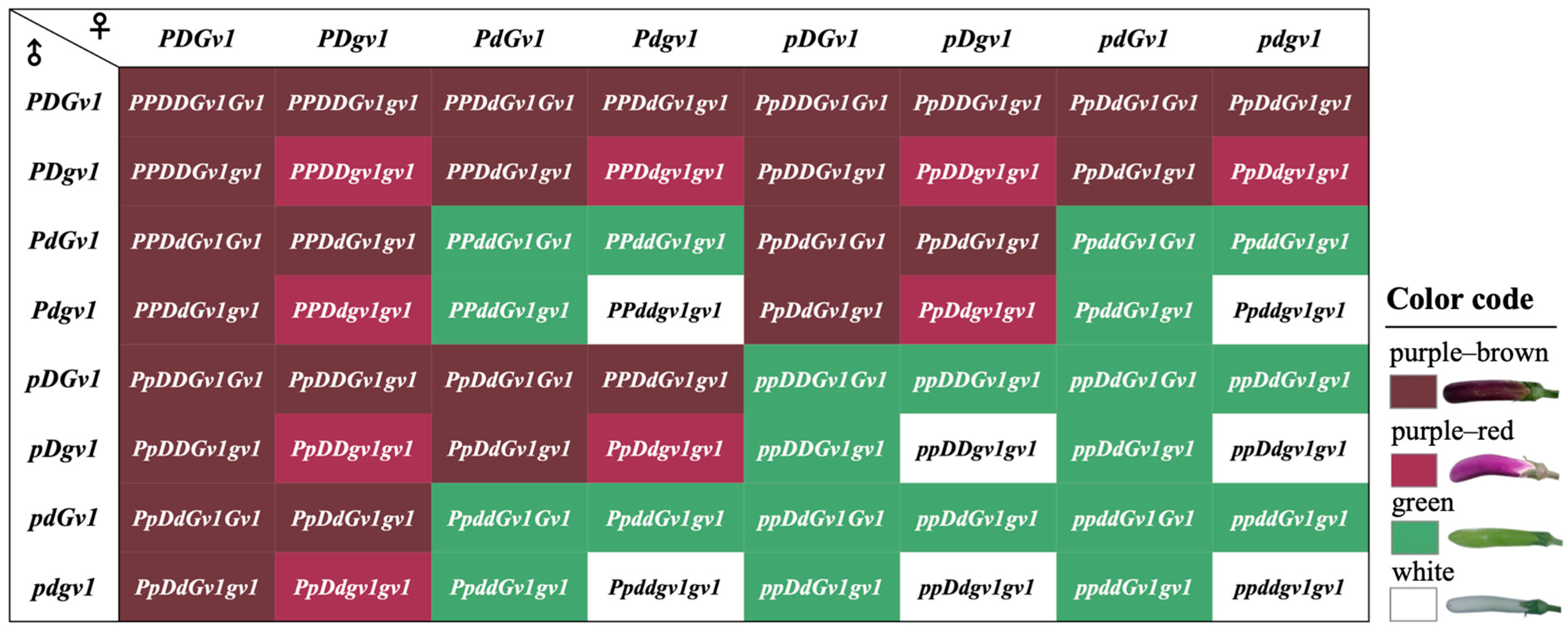 | Purple–brown | DD | PP | Gv1_ | DDPPGv1_ | 6 |