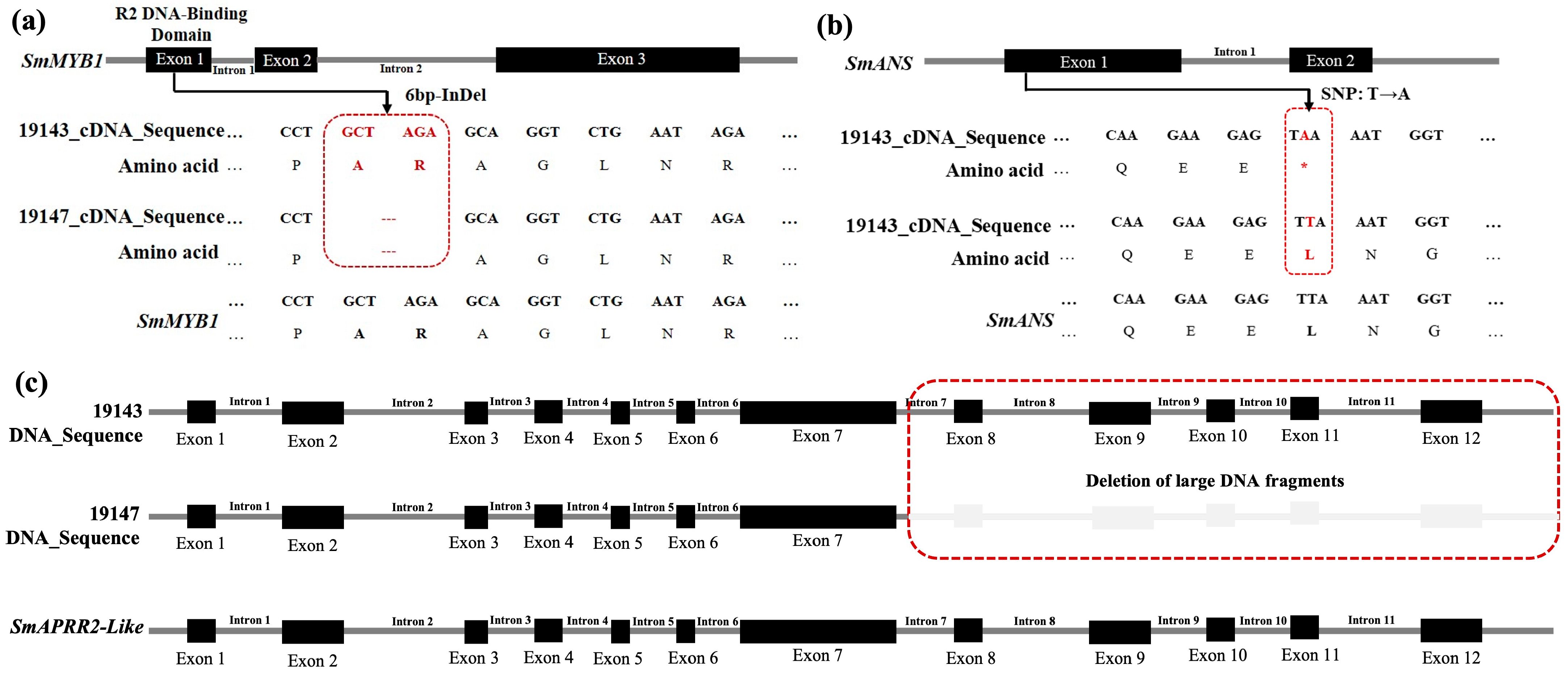 3.7. Cloning and Sequence Comparative Analysis of Candidate Genes SmMYB1, SmANS, and SmAPRR2-like in Parental Lines