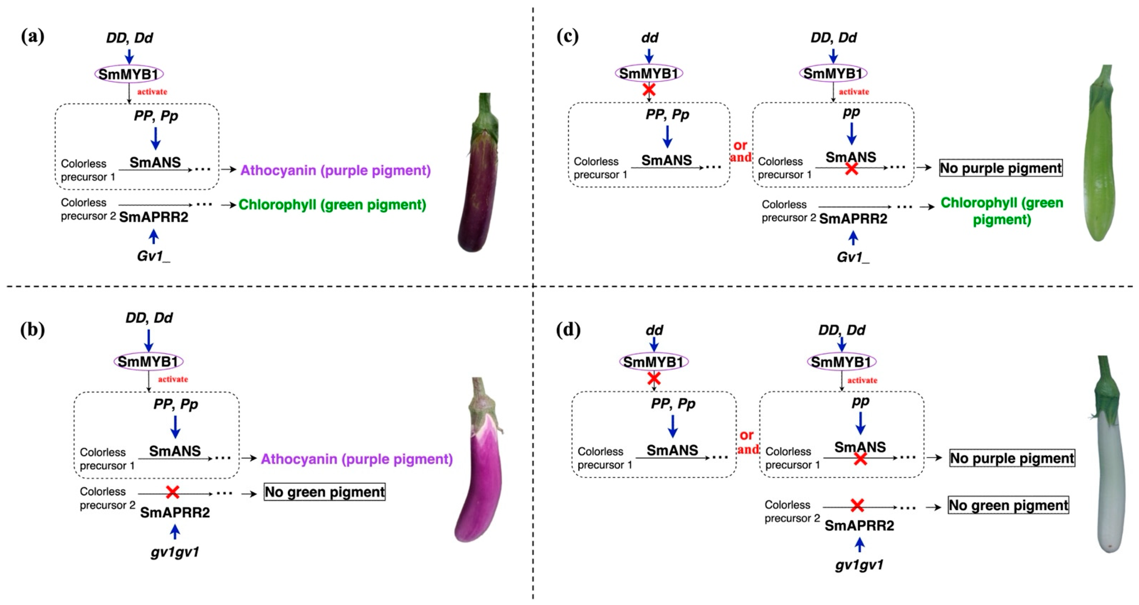 4.4. Genetic Model of D, P, and Gv1 Interacting to Regulate Eggplant Peel Color
