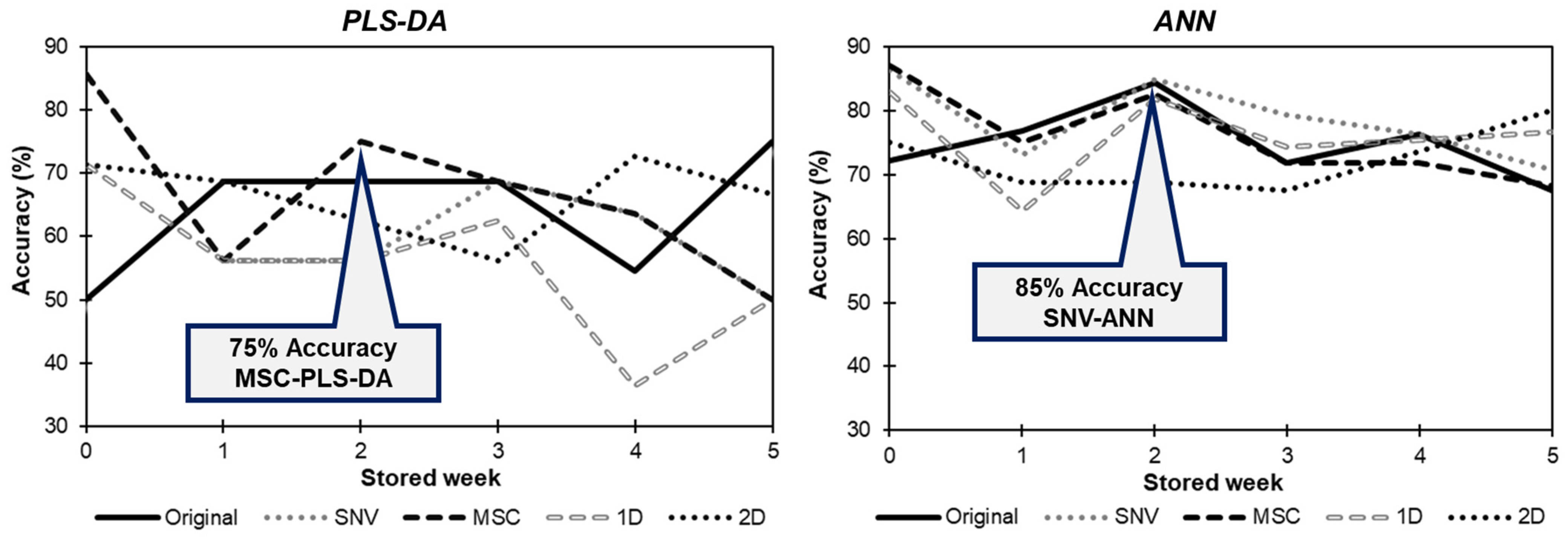 | Week | Optimal Data Preprocessing and Accuracy; PLS-DA | Optimal Data Preprocessing and Accuracy; ANN | Accuracy Gain (%) | F1-Score (ANN) | Key Observation |