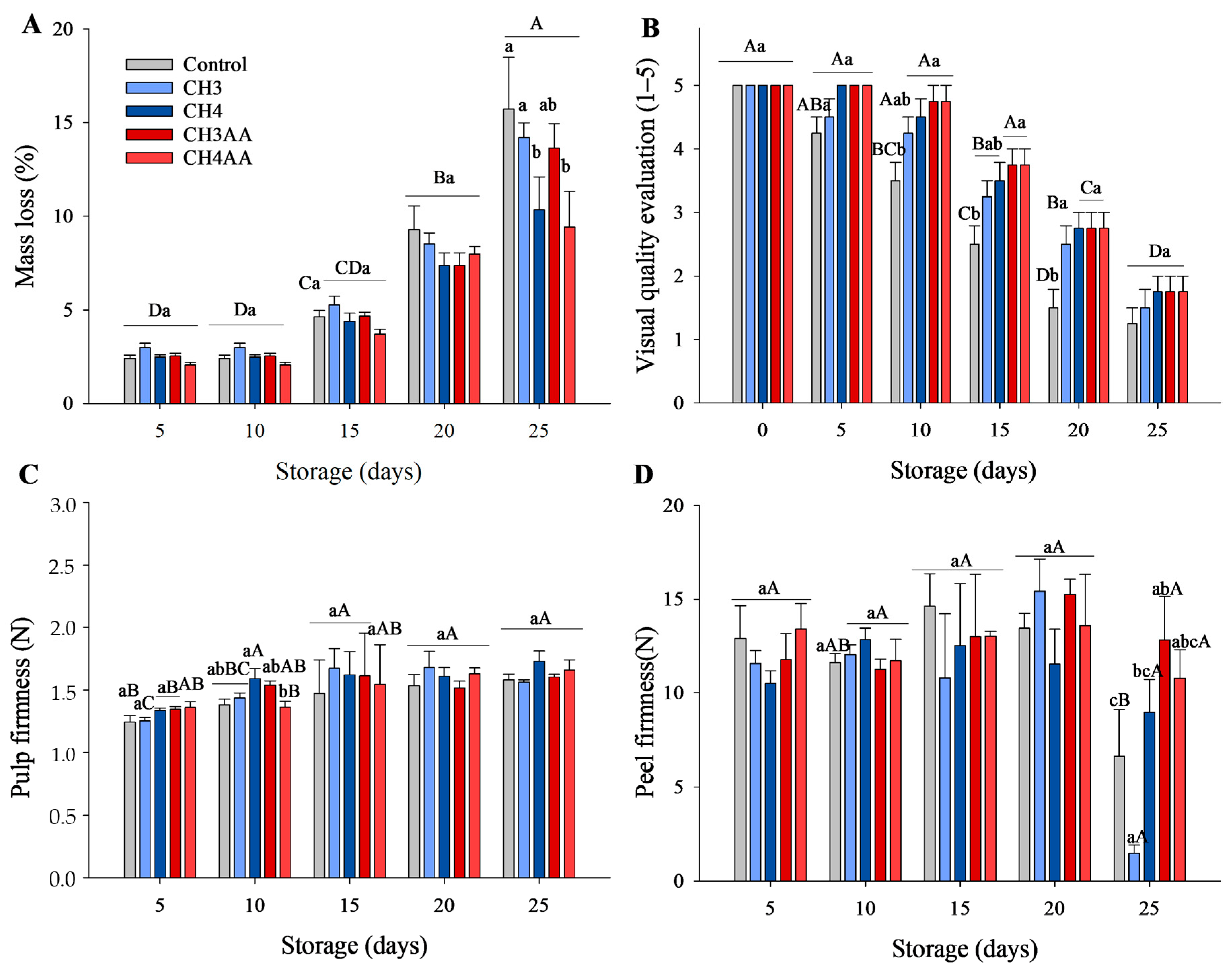 32]. The enhanced preservation observed in this study was directly related with the reduced dehydration of fruits treated with CH3AA and CH4AA treatments (