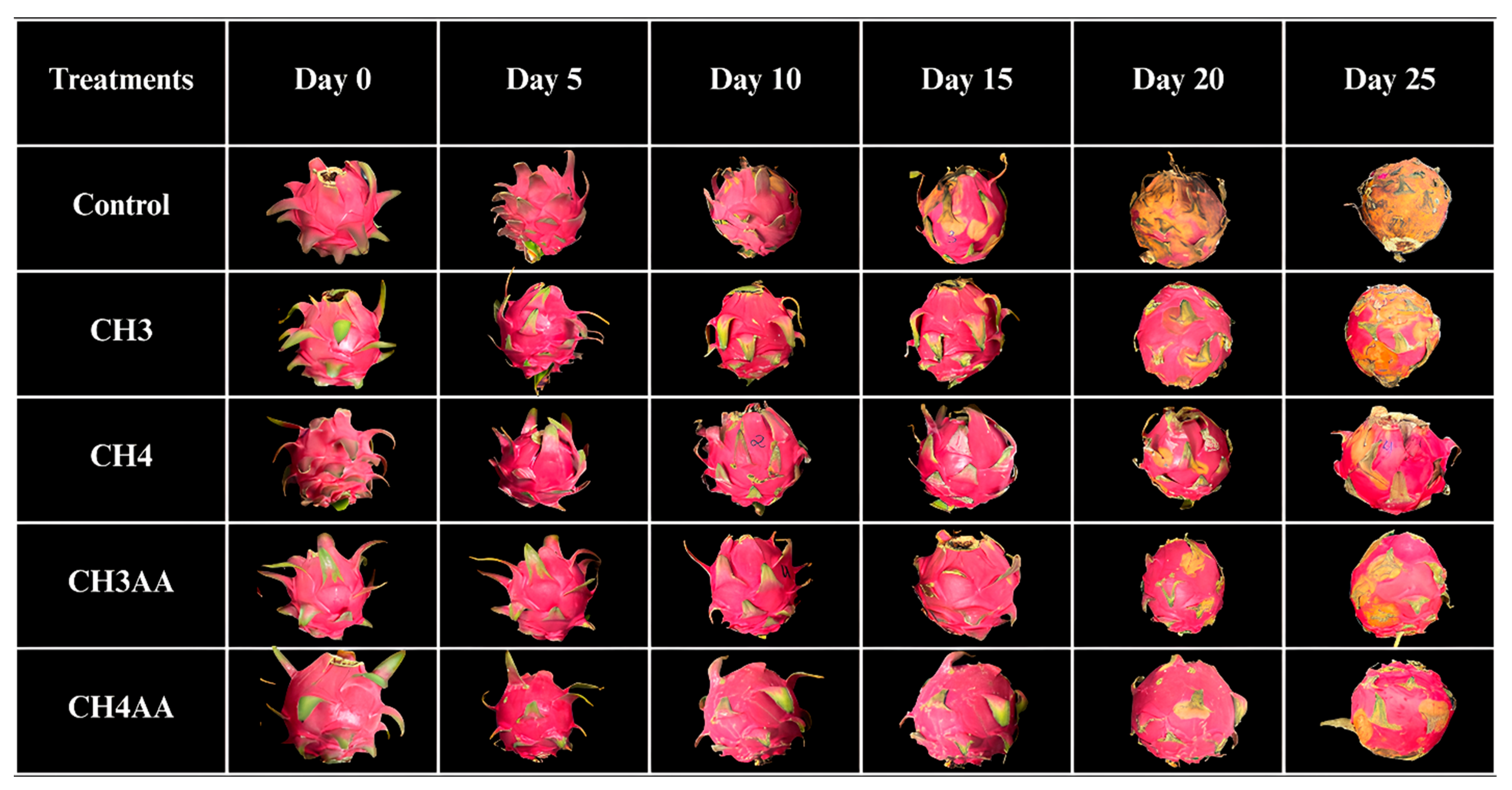 The decline in the visual and physical quality of the control, CH3, and CH4 fruits after 10 days was attributed to excessive dehydration (