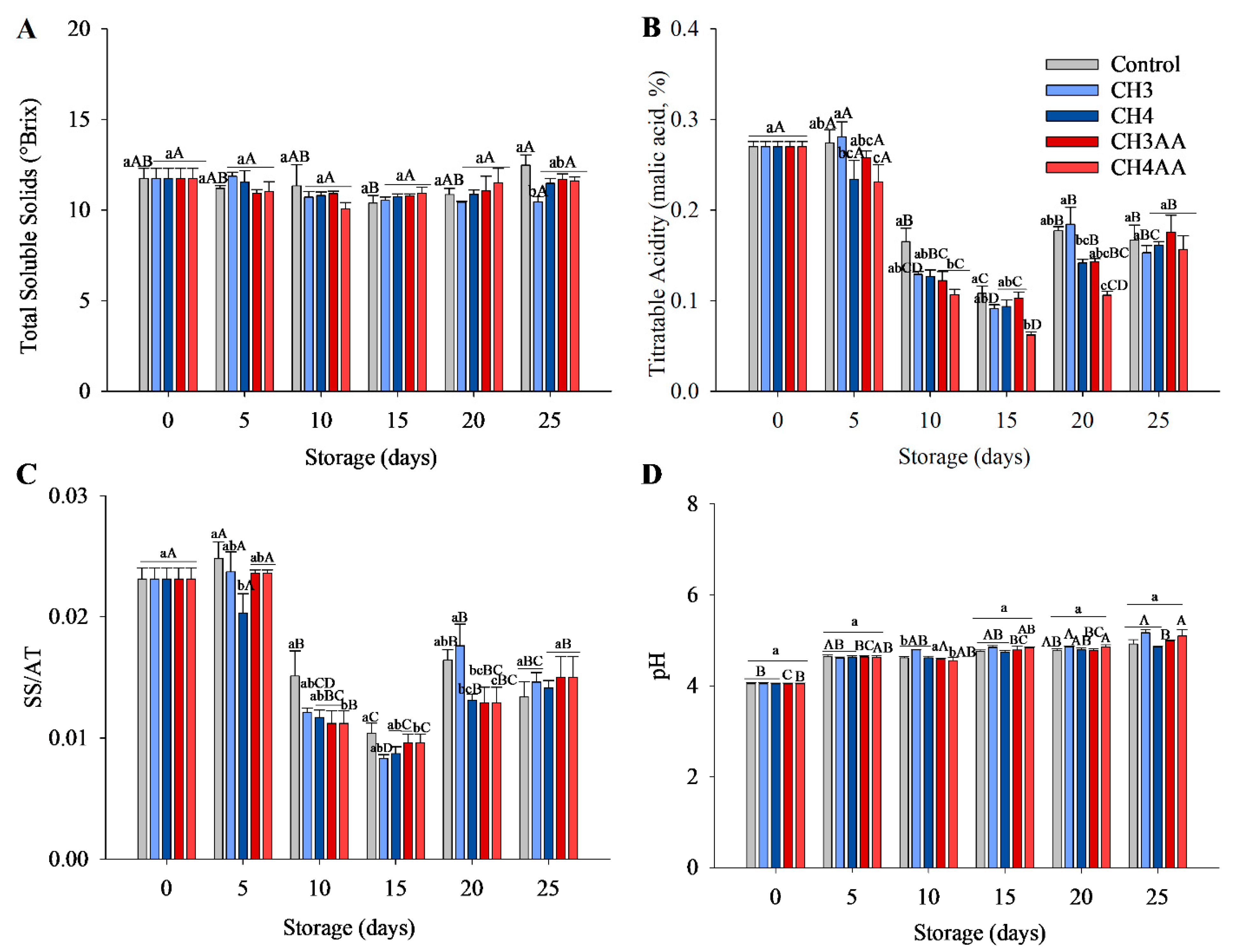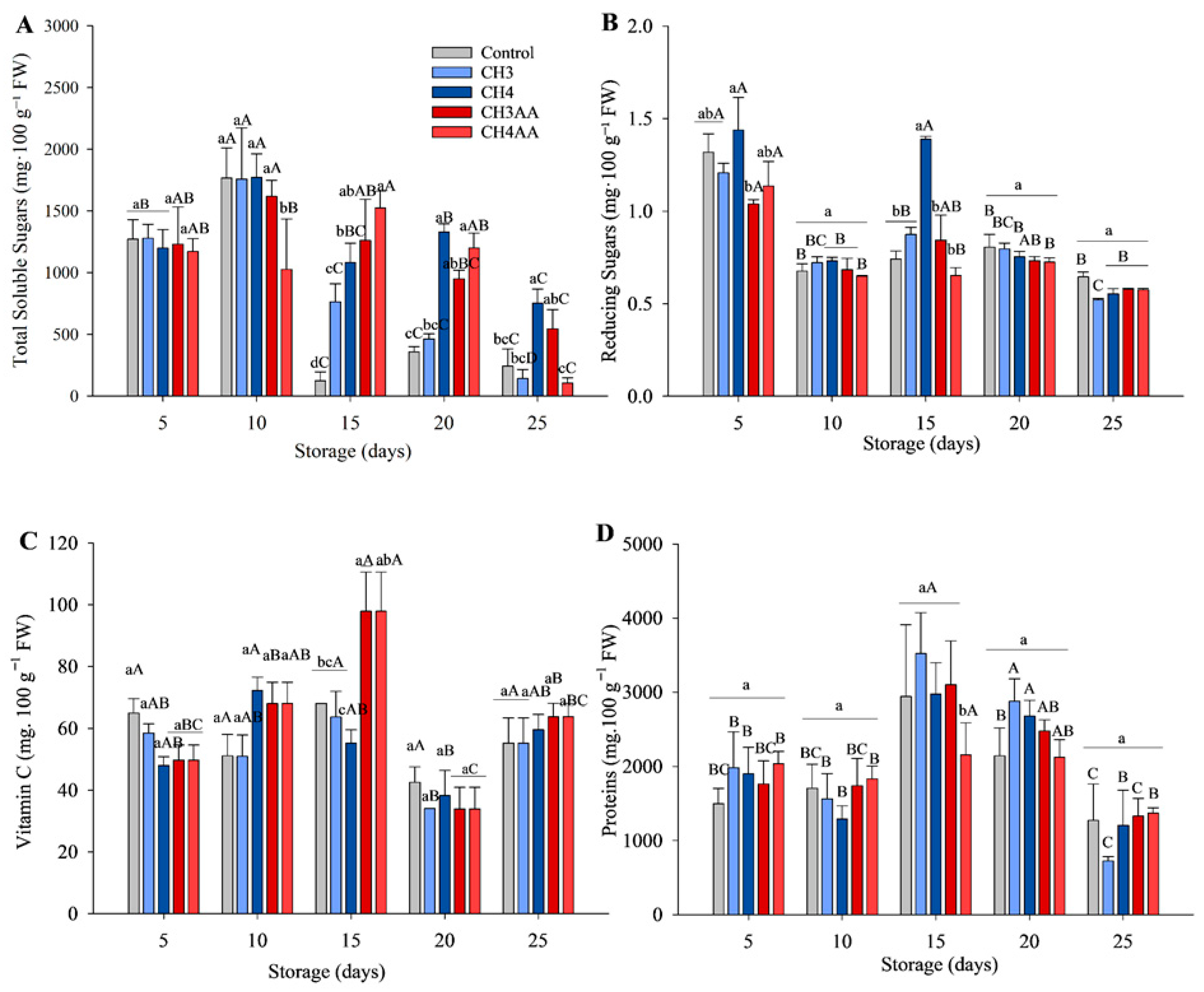 Figure 5A) were significantly affected by this interaction, with an initial increase up to 10 days of storage followed by a general decline. At 10 days, no significant differences were observed among treatments, as indicated by the identical lowercase letters across all groups. From 15 days onward, CH3AA and CH4AA consistently exhibited higher sugar contents compared to the control, exceeding it by approximately 30%, while CH3 and CH4 showed intermediate values. At 25 days, all treatments exhibited reduced levels, with the lowest values recorded in the control and CH3 groups, while CH4 maintained comparatively higher contents. Reducing sugars (