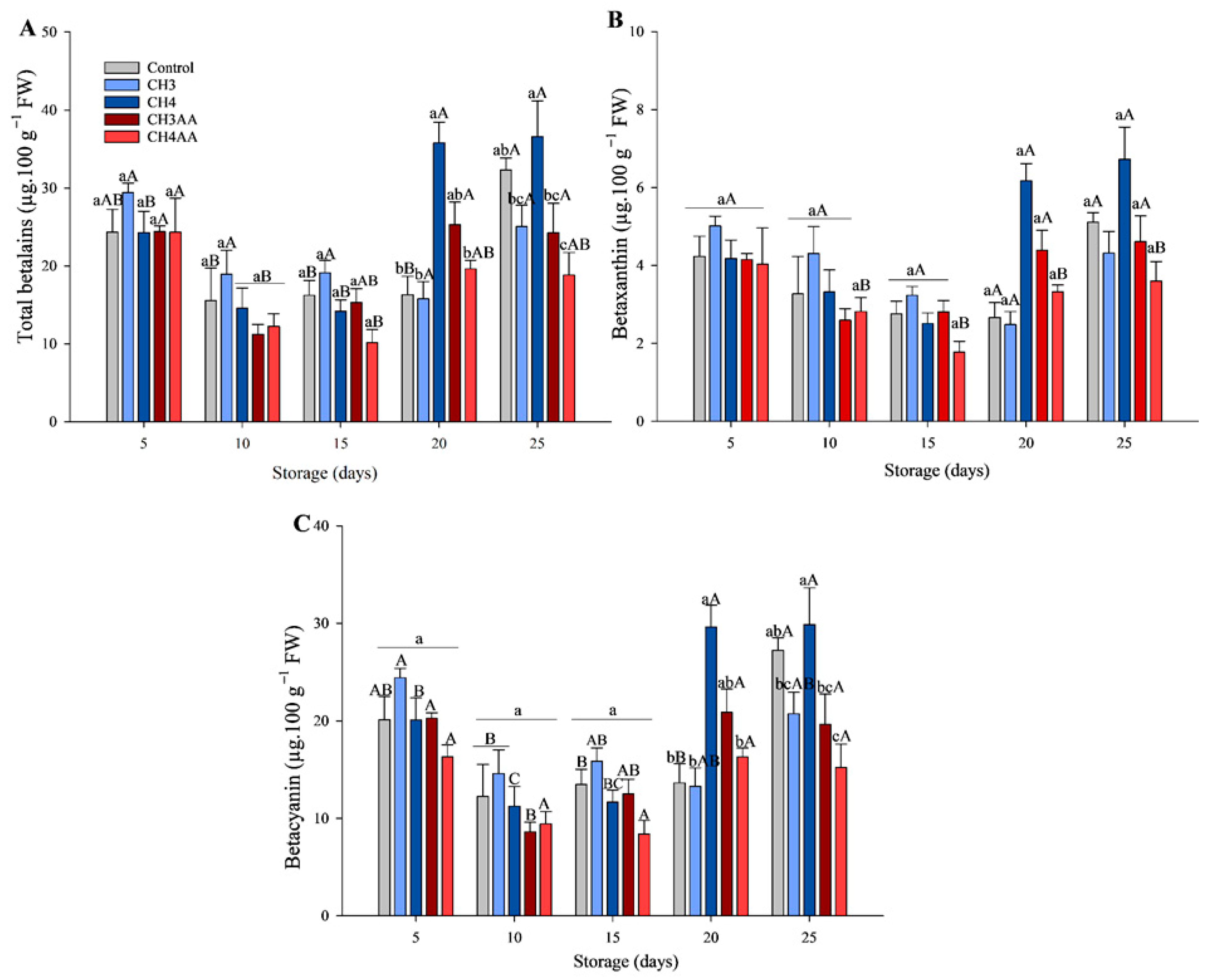 Figure 5A,B), evidencing a behavior dependent on the combination of treatment and storage period. During the initial days, no consistent differences were observed among the treatments. Up to 10 days the period corresponding to the marketable life of the control, CH3, and CH4 fruits a downward trend in pigment content was observed, with no notable distinctions among these treatments. From day 15 onwards, the responses became more evident, with lower concentrations in fruits treated with ascorbic acid combinations and higher accumulation in those with isolated chitosan treatments, especially CH4 during the later stages of storage. At 20 and 25 days, the increase observed in CH4 and the control indicates an intensification of secondary metabolism and a possible concentration of pigments due to water loss and the advancement of ripening. For betaxanthins, there was no significant effect of the treatments throughout storage (
