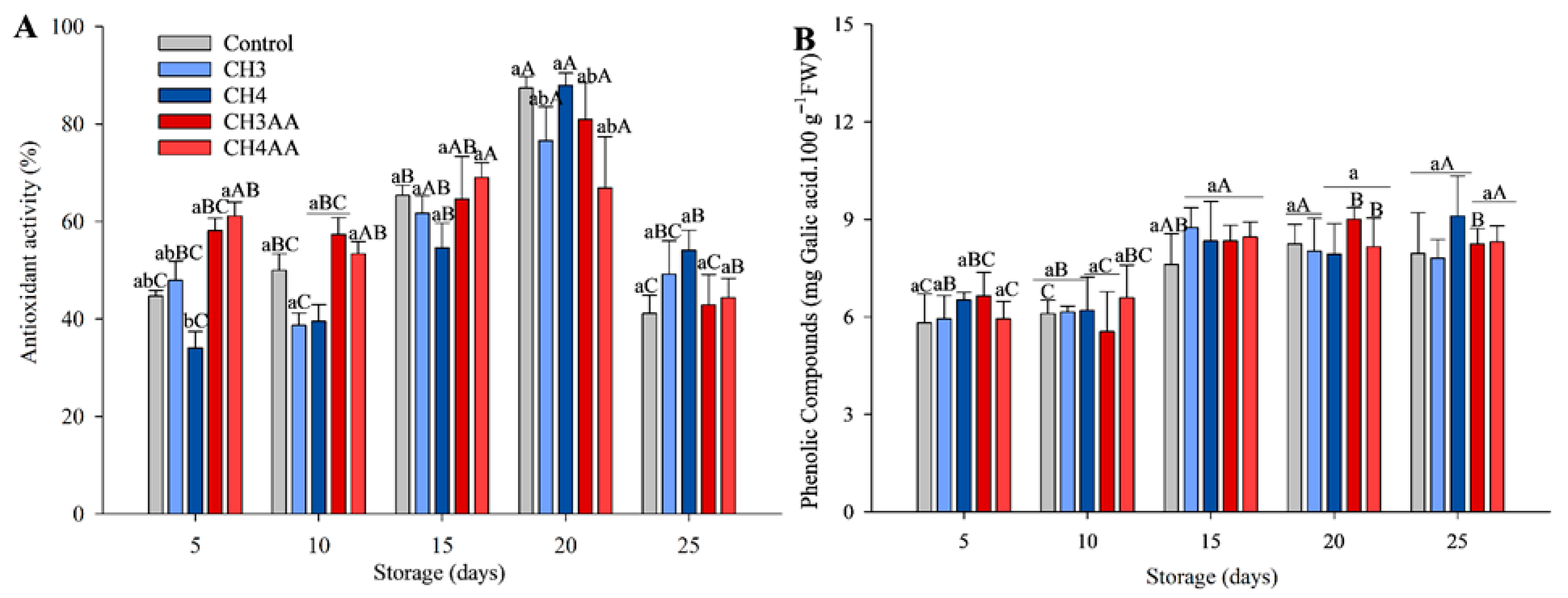 Figure 6A), showing an upward trend throughout storage, with the highest values observed at 20 days. Up to 10 days the period corresponding to the marketable life of the control, CH3, and CH4 fruits, no consistent differences were observed among the treatments. At day 15, an increase in antioxidant activity began, which intensified by day 20, when the control, CH3, CH4, and CH3AA treatments exhibited similar and higher responses. By day 25, differentiation among the coating treatments was observed, with CH4 standing out. Regarding phenolic compounds (