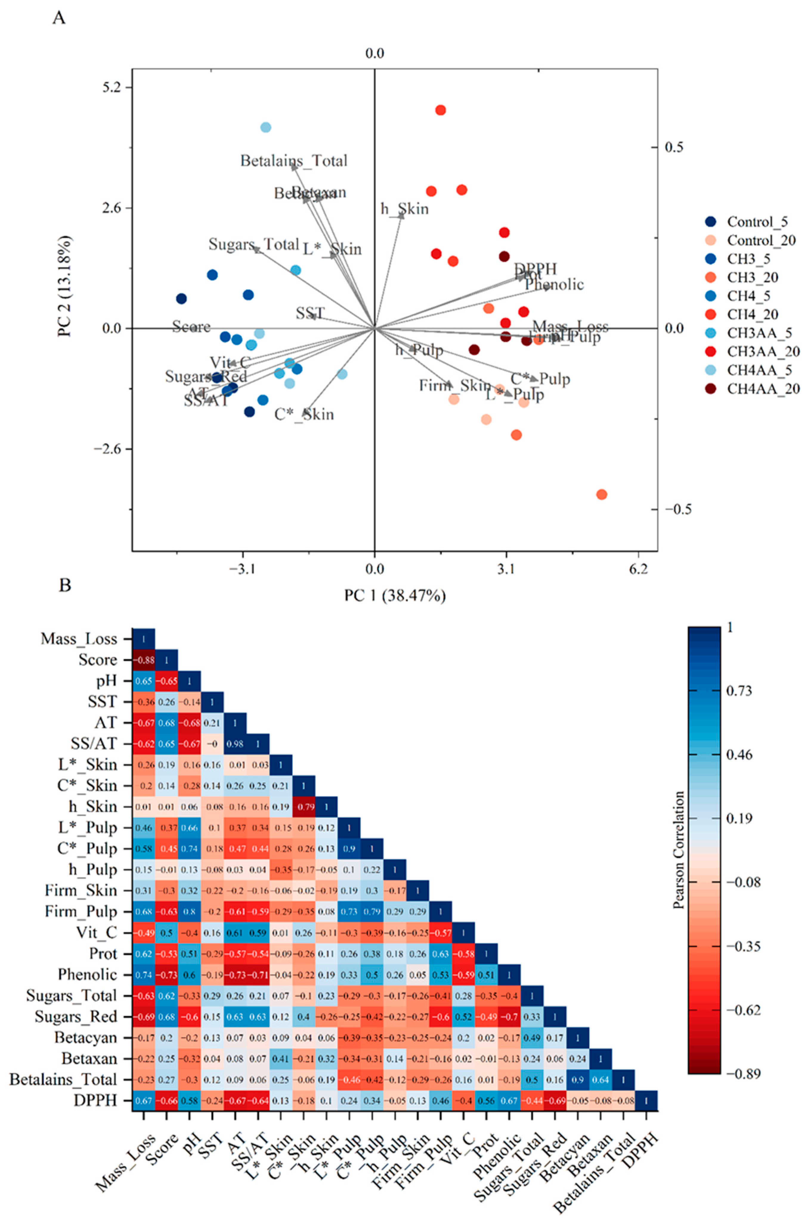 Figure 7A). PC1 was associated with fresh weight loss, total phenolic compounds, and antioxidant activity (DPPH), contributing to the distinction of fruits at 20 days. The CH3AA and CH4AA treatments showed a tendency to cluster in the positive quadrant of this component. Conversely, fruits evaluated at 5 days clustered on the negative side of PC1, associated with higher visual appearance scores, total sugars, total soluble solids, and vitamin C. PC2 contributed primarily to the separation related to betalains. These results should be interpreted as a descriptive tool for visualizing multivariate patterns and do not imply direct causal relationships.