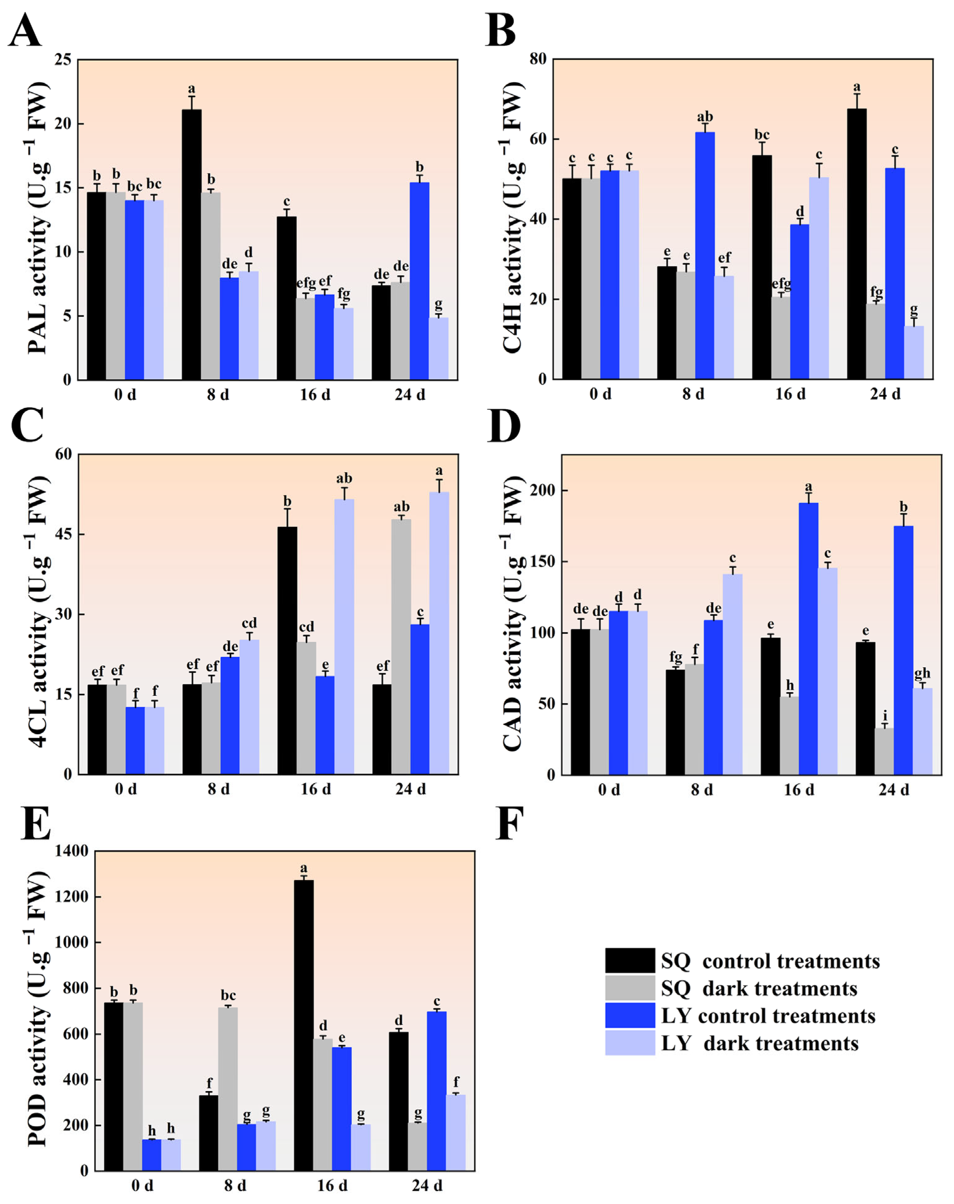 28]. In this study, 4CL activity in control ‘SQ’ showed an initial increase followed by a decline, while all other treatment groups exhibited a gradual increase. Overall, 4CL activity was higher under shading than in controls, with more pronounced temporal changes. Initially, 4CL activity was slightly higher in ‘SQ’ than in ‘LY’; however, from 8 to 24 d, ‘SQ’ showed lower activity than ‘LY’. At 24 d, the largest differences between treatments were observed, with differences of 30 U·g