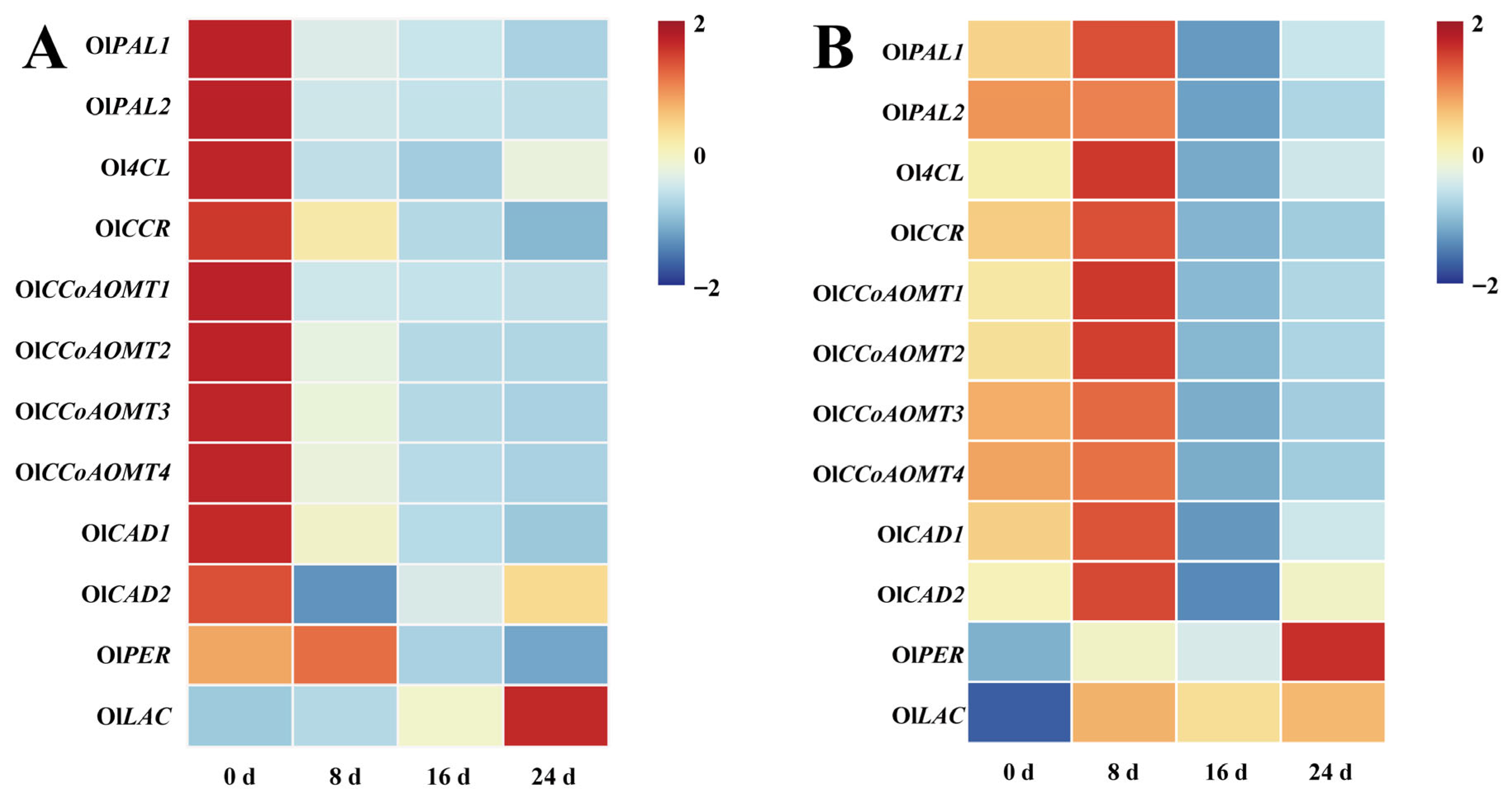 OlLAC showed the most significant upregulation, reaching 15-fold of their initial levels. At 16 d, these two genes exhibited the smallest decline, still maintaining over 10-fold of their initial levels; other genes showed a marked decrease, with the maximum reduction exceeding 20-fold compared to the early stage. By 24 d, the expression of