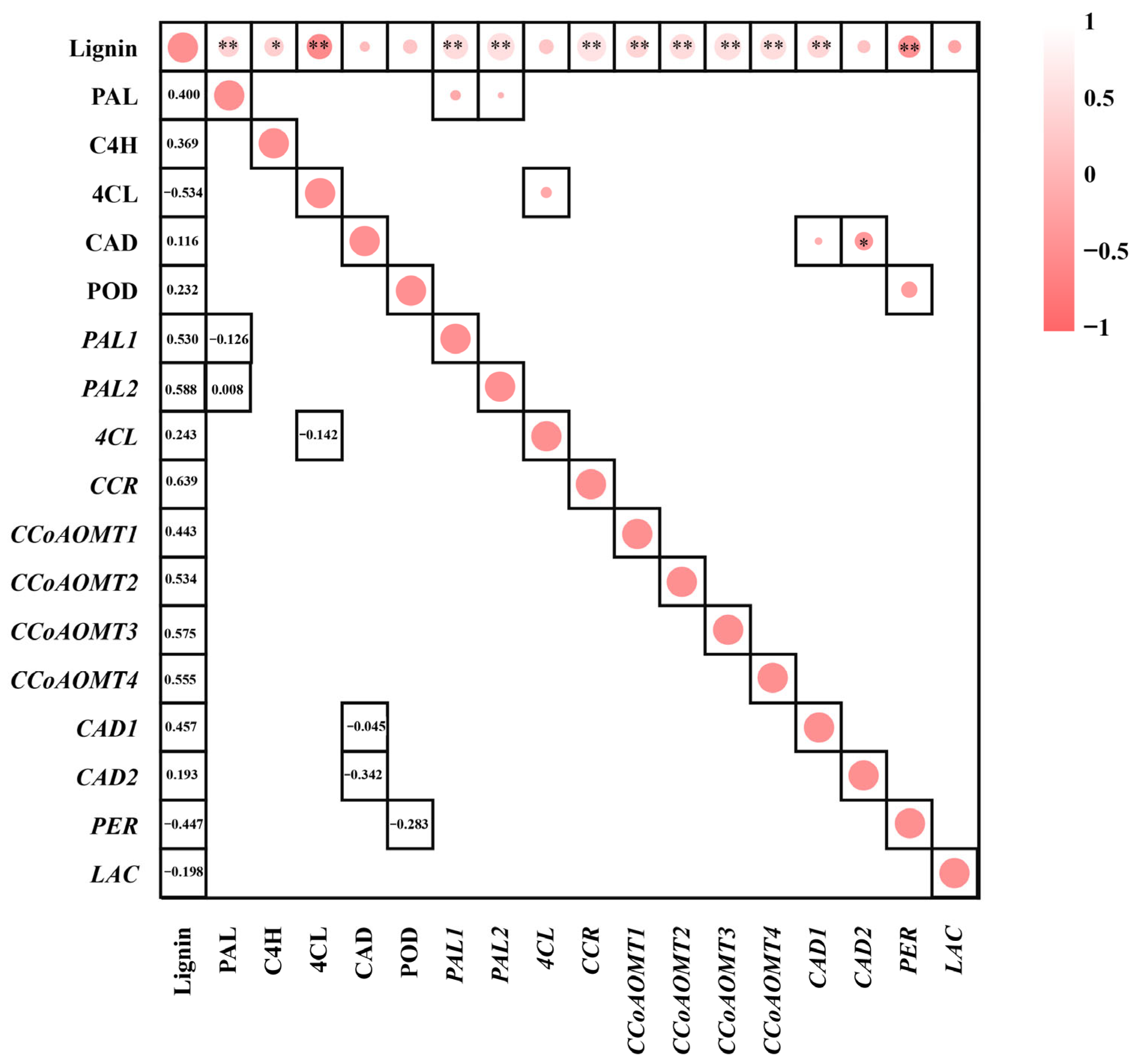 Lignin content showed significant positive correlations with PAL (r = 0.400, p < 0.05) and C4H (r = 0.369, p < 0.05) activities. Additionally, lignin content was significantly positively correlated with the expression levels of PAL1 (r = 0.530), PAL2 (r = 0.588), CCR (r = 0.639), CCoAOMT1 (r = 0.443), CCoAOMT2 (r = 0.534), CCoAOMT3 (r = 0.575), CCoAOMT4 (r = 0.555), and CAD1 (r = 0.457) (p < 0.05 for all). In contrast, lignin content was significantly negatively correlated with 4CL activity and PER expression (−0.534, −0.447). Further analysis of the relationships between enzyme activities and their corresponding gene expression levels revealed that PAL activity showed a non-significant negative correlation with PAL1 (r = −0.126) and a non-significant positive correlation with PAL2 (r = 0.008). 4CL activity was non-significantly negatively correlated with 4CL expression (r = −0.142). CAD activity exhibited a significant negative correlation with CAD1 (r = −0.342, p < 0.05), while POD activity showed a non-significant negative correlation with PER (r = −0.283).