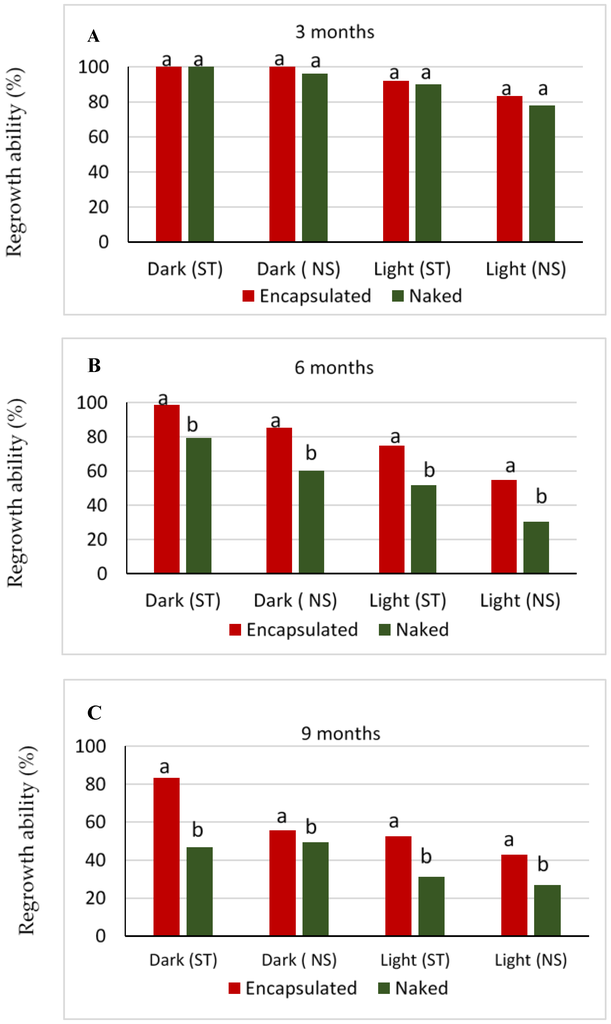 Regrowth ability (%) of encapsulated and naked shoot tips (ST) or nodal segments (NS) of “Kober 5BB” rootstock stored at 4 °C in darkness and light conditions for each storage period. (A) three months; (B) six months; (C) nine months. Different letters indicate percentages of encapsulated versus naked means within tissue type and light versus dark conditions that significantly differed (χ2 test, p ≤ 0.05) at each storage period.