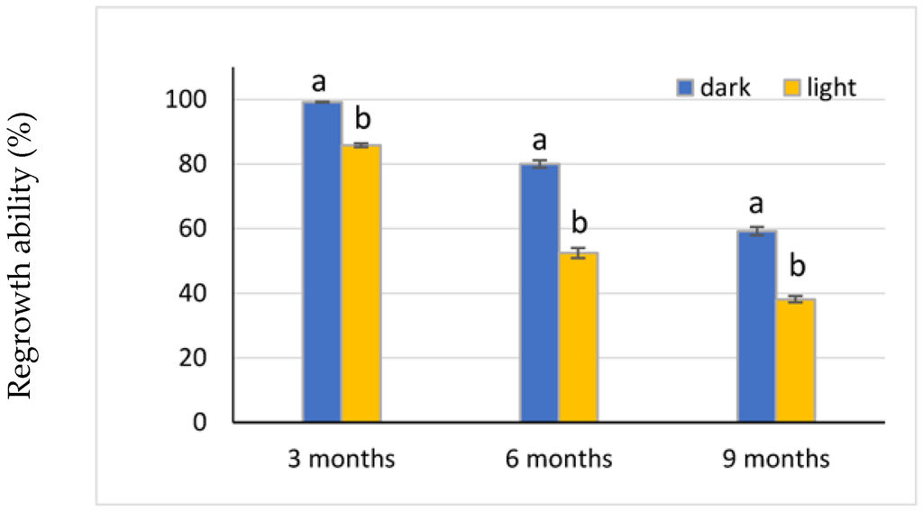 Effect of dark versus light on explant regrowth after 3, 6, and 9 months of 4 °C storage. Different letters indicate percentages for dark versus light that significantly differed (χ2 test, p ≤ 0.05) at each storage period.