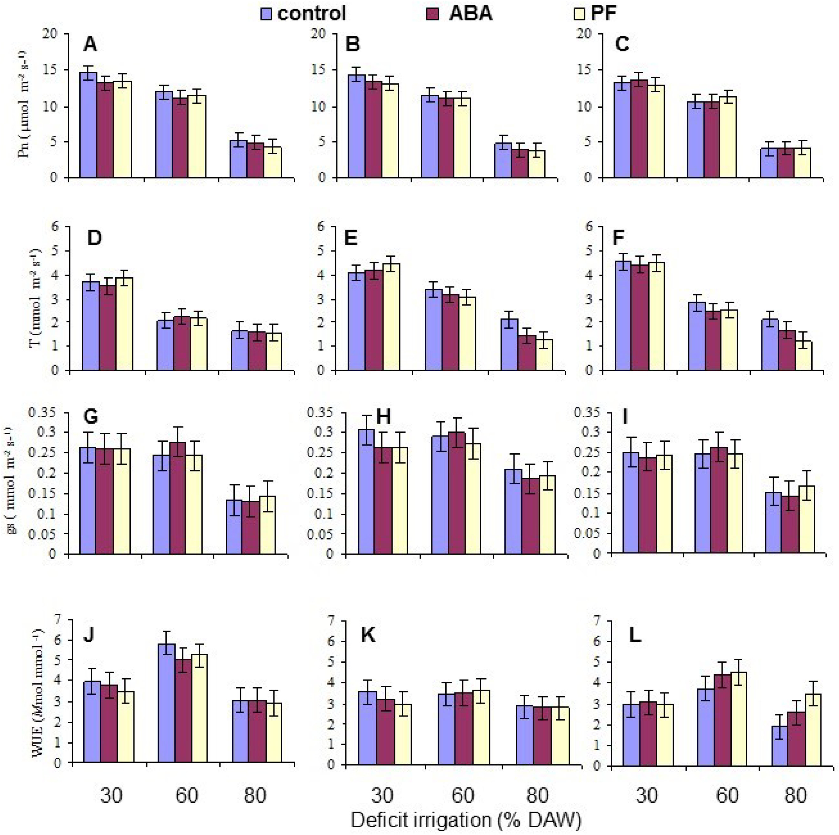 | Water use efficiency (Pn/T) | 4.04 a | 3.20 b | 3.29 b | 3.34 b | 4.37 a | 2.81 b |