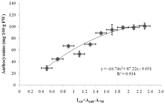 For cherry, the ripening stage expressed as IAD correlates with anthocyanin content (Figure 2) as well as with other traits normally used to assess fruit quality [].