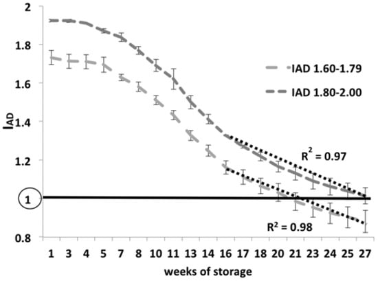 Ripening trends expressed as IAD class during storage of “Abbé Fétel” pear fruit. An IAD value = 1 shown in the figure represents the beginning of skin color change from green to yellow. In the last phase of storage, the IAD change tends to be linear.