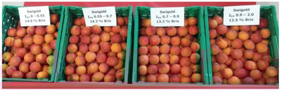 Moreover, the differences detected by these new devices, and represented by the IAD index, are economically useful since the consumers are able to recognize the differences in ripening determined by the DA-Meter and appreciate more ripened fruit (Table 1). The same information was also obtained with several cultivars of apricot where the fruit were grouped into classes of uniform ripening with the DA-head device. Notably, consumer appreciation was related to fruit quality/ripening and but was influenced very little by appearance for “Swigold” apricot. In fact, although fruit ripening was quite different among the classes (4 classes characterized by the following IAD values, 0–0.5; 0.5–0.7; 0.7–0.9, and 0.9–2.0, and by the soluble solids content, 14.9; 14.2; 13.2 and 12.5 °Brix, respectively, fruit appearance (skin color and fruit size) in the 4 classes was practically identical (Figure 4) [], demonstrating that the traditional methodologies, such as colorimeter or caliper measurements, are not suitable for effectively determining fruit physiological stage.