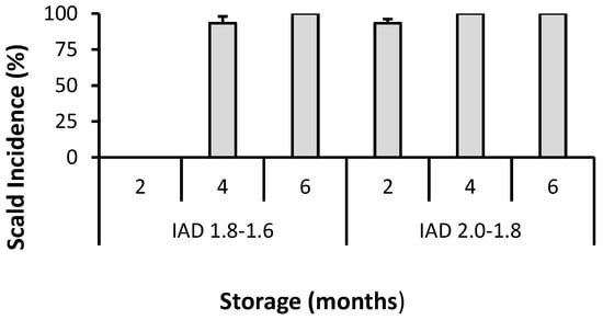 Several studies have pointed out that fruit disease susceptibility is related to the ripening stage reached by the fruit at harvest [,,]. In apple, superficial scald susceptibility trials were performed with 3 varieties, “Red Delicious”, “Granny Smith”, and “Pink Lady”, and revealed that when the harvest was performed too early, the fruit were significantly affected by scald. For the susceptible variety “Granny Smith”, fruit were harvested at an IAD value of 1.8–2.0 (early ripening, fruit not fully ripe). Scald incidence reached 100% after just two months of storage. In contrast, when fruit were harvested later at a more advanced ripening stage (IAD of 1.6–1.8), fruit were not affected by superficial scald within the first two months of storage (Figure 5) [].