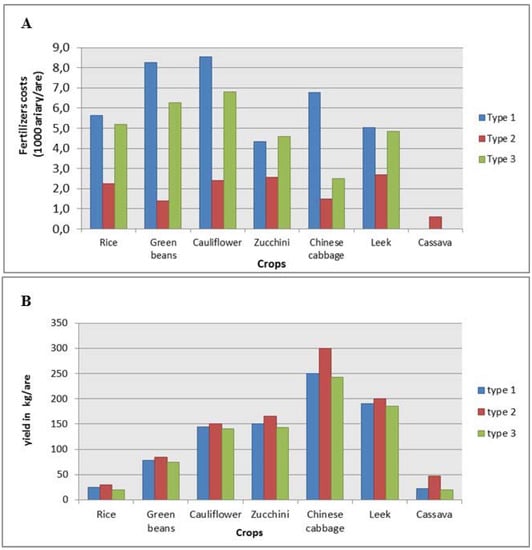 Comparison of (A) fertilizer costs and (B) yields for several crops by household type using Wilks’ Lambda test. Area units are “are”, or 100 m2 or 0.01 ha.