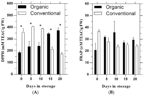 Changes in antioxidant activities by the DPPH (A) and FRAP (B) assays of tomato fruit during cold storage following production under organic and conventional production systems. Bars represent standard errors. * indicate the significant difference (p ≤ 0.05).