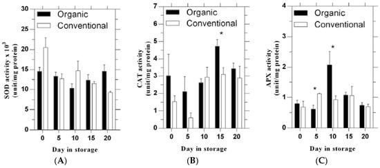 SOD activity did not statistically differ between the two production systems across days of storage (Figure 2A). CAT activity did not differ between systems except at 15 days of storage when the organic system value was significantly greater than the conventional system (Figure 2B). No significant differences between systems were found for APX activity except that the organic value was significantly lower at 5 and higher at 10 days of storage than the conventional value (Figure 2C).