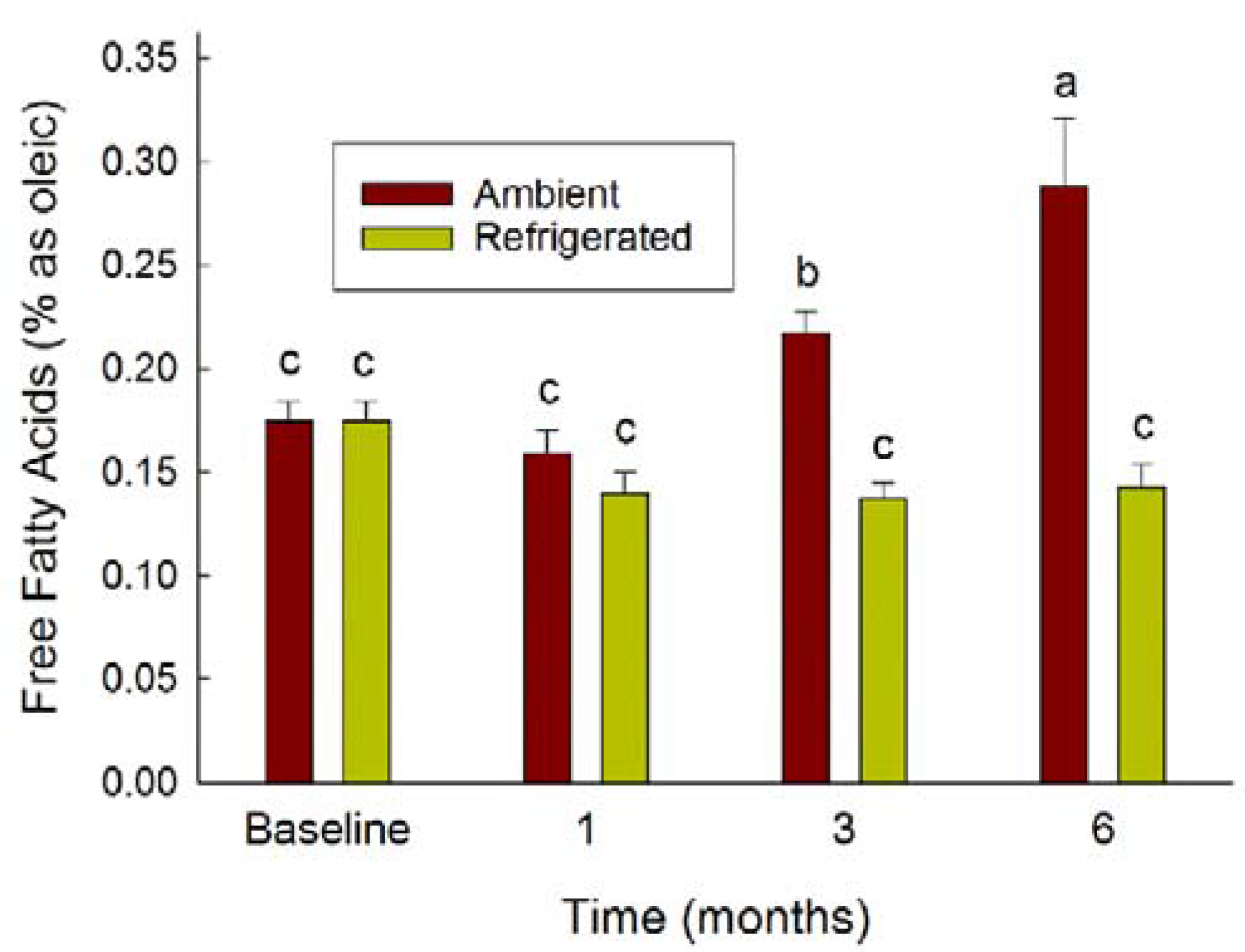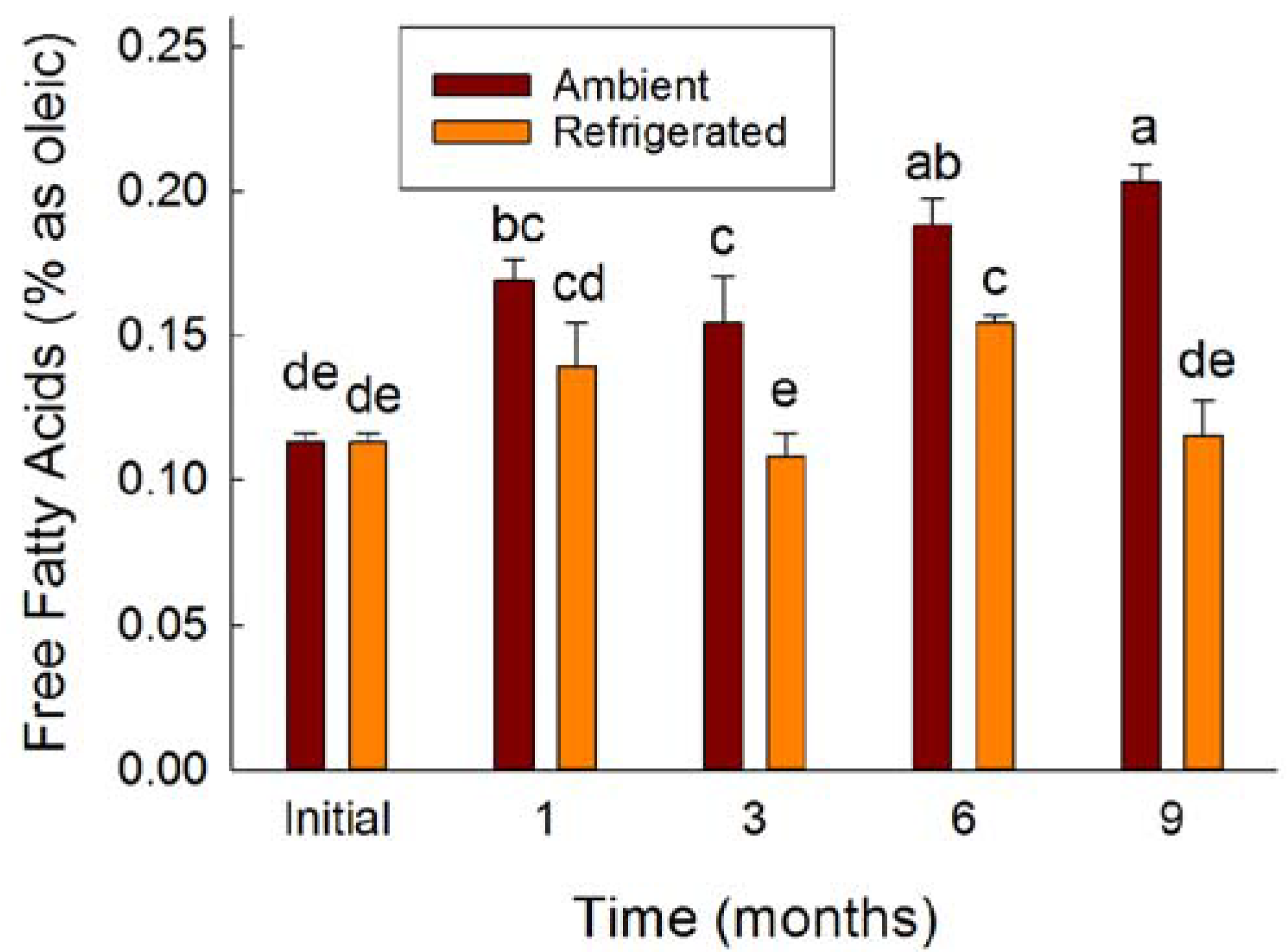 Free fatty acid values were generally low (≤0.2) during laboratory storage for nine months; however, there was a significant upward trend in FFA at ambient temperatures (p < 0.001, Figure 2).