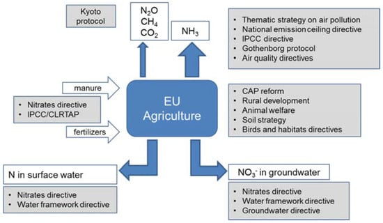 Overview of the EU policy instruments affecting the use and losses of nitrogen in agriculture (CLRTAP, Convention on Long Range Transport of Atmospheric Pollutants; IPPC, directive on integrated pollution, prevention and control; CAP, common agricultural policy) (adapted from [10]).